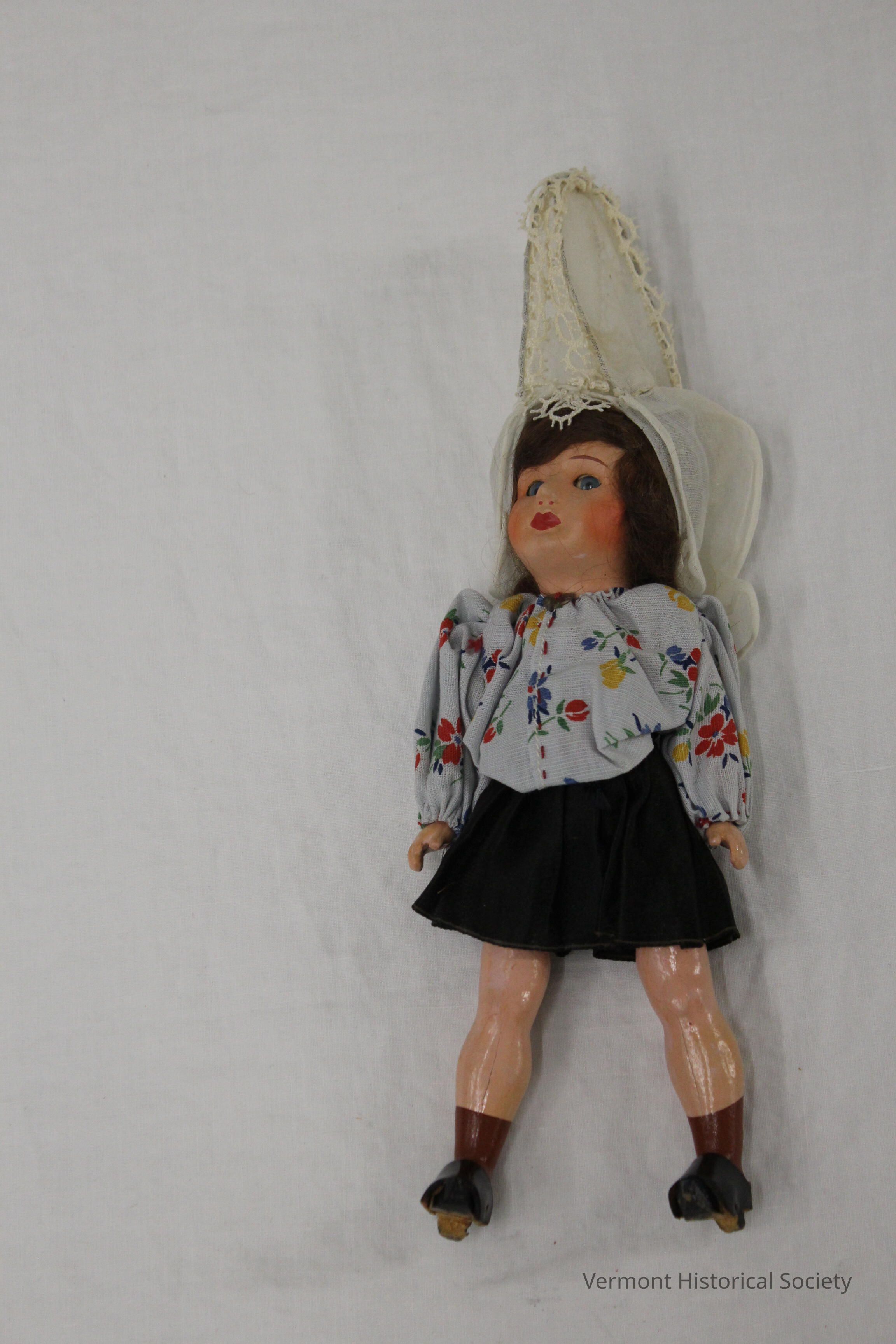 Doll in black skirt, pale blue flowered blouse, tall white lace hat with wire loops, two black clogs, brown hair.Context