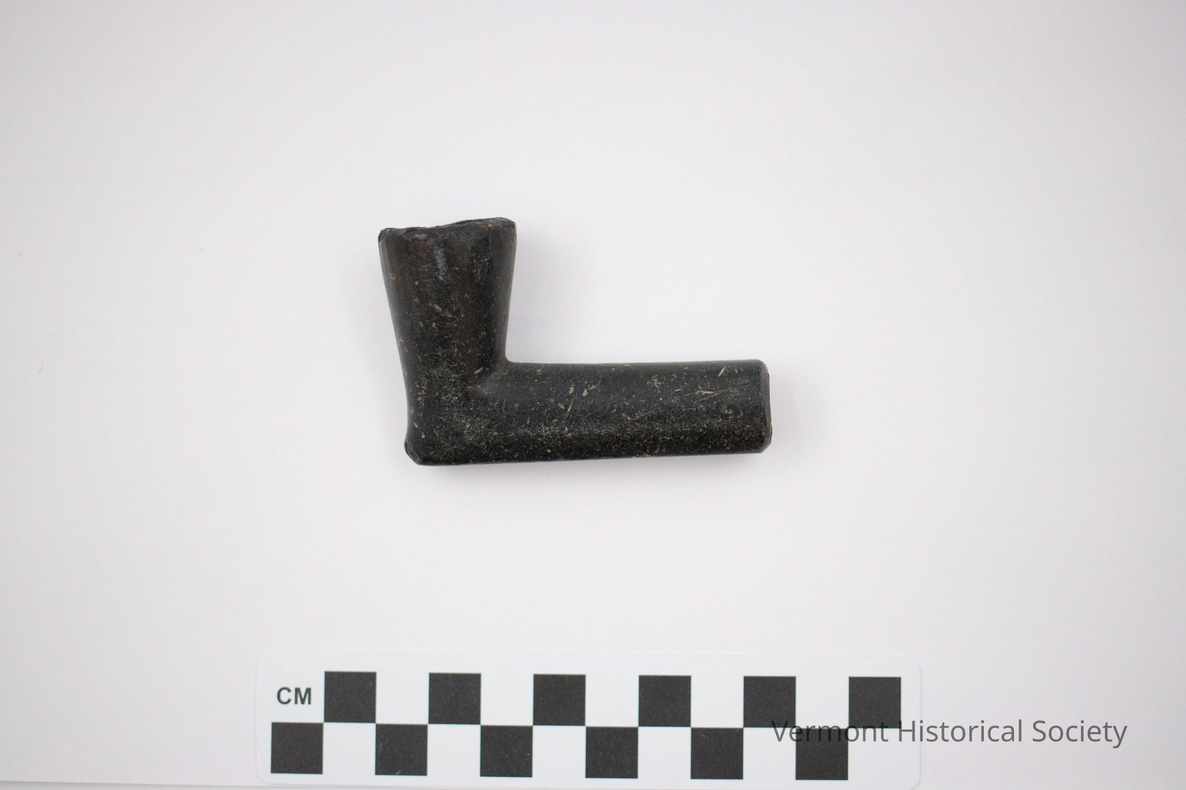 Ground stone pipe. The pipe is completely polished with shallow, drilled circles along the bottom of the stem as decoration. One side of the bowl has a small hole that has been plugged with wood.