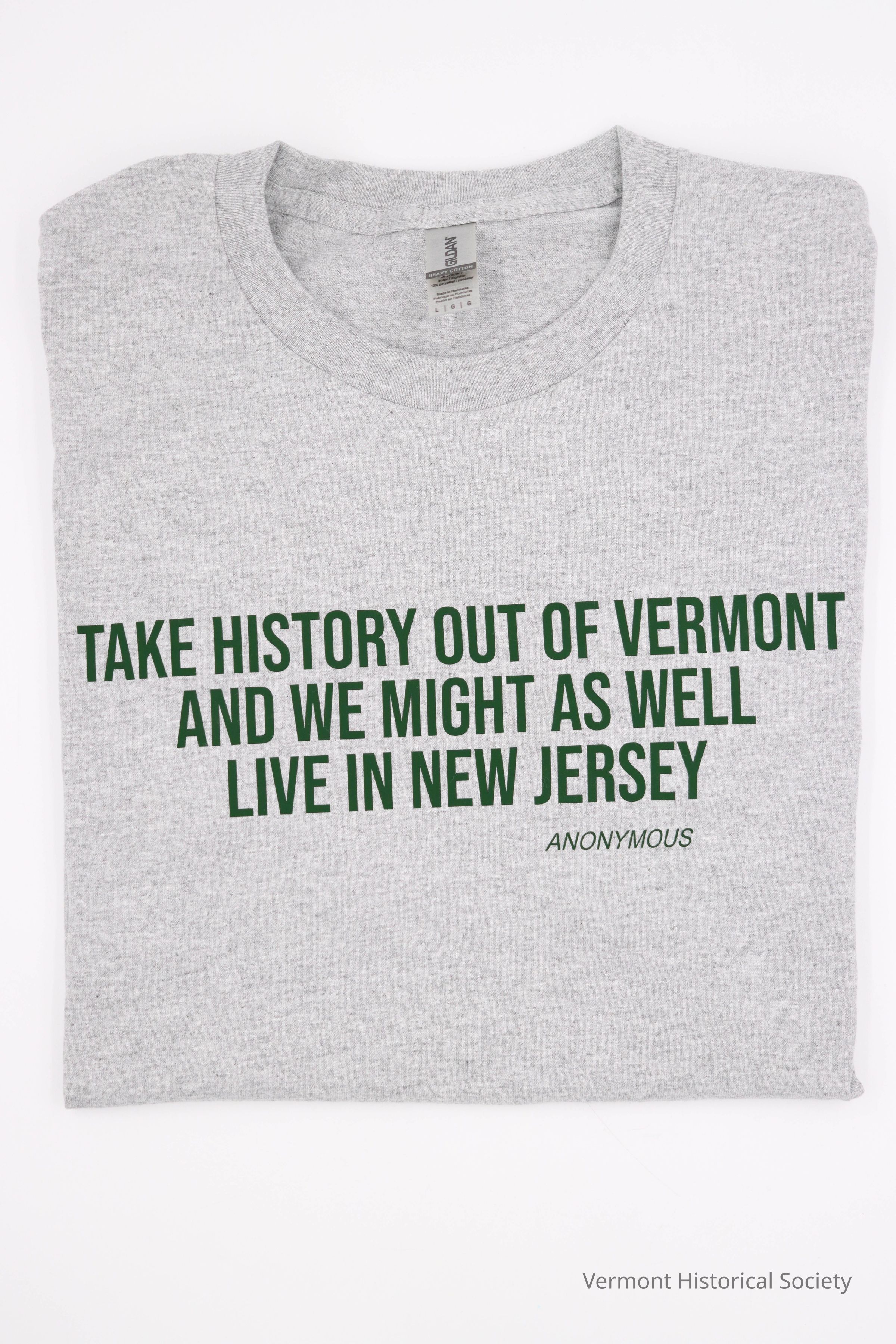 Heather grey t-shirt printed across the front in green with the words, "TAKE HISTORY OUT OF VERMONT AND WE MIGHT AS WELL LIVE IN NEW JERSEY / ANONYMOUS".