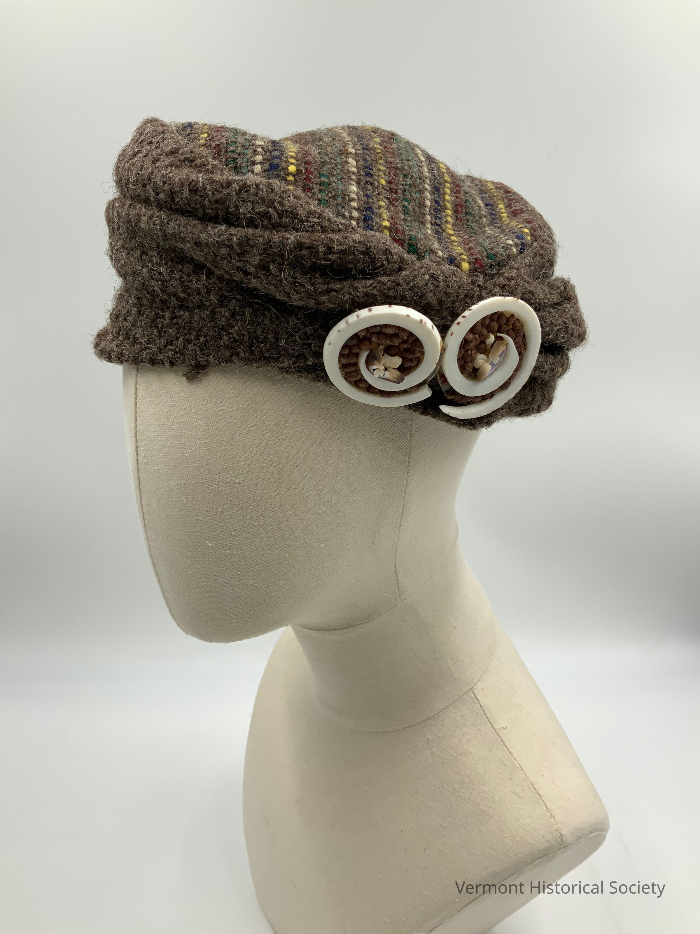 Wool hat with 2 shell ornaments. The hat has a low, flat crown and no brim. The sides are made wide over a narrow lining, giving them a slouched appearance. The top of the crown in woven with colorful stripes on a grey ground, while the sides are plain grey. The shell ornaments are side-by-side on the side of the hat.Context