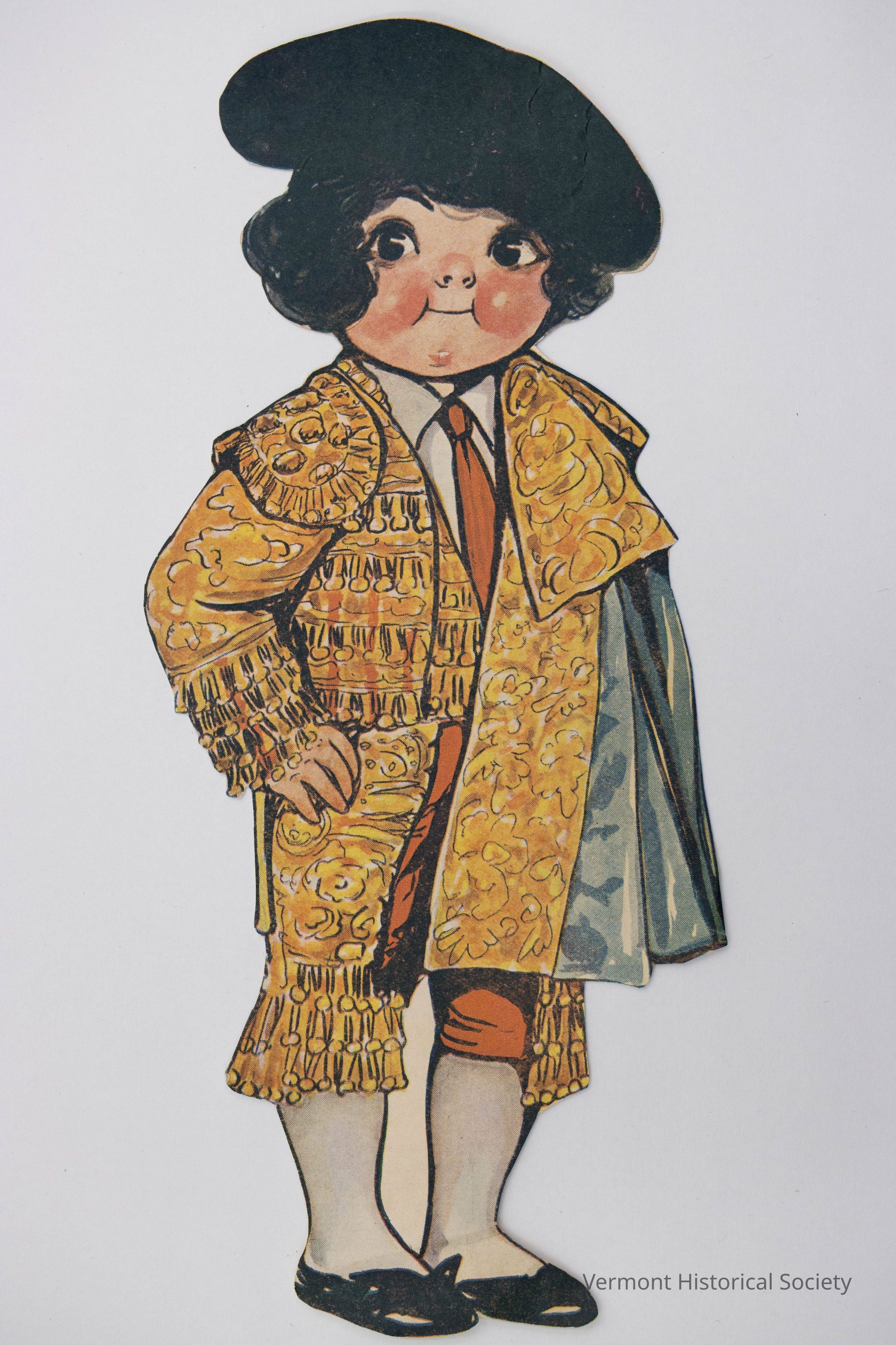 Small paper doll. The doll depicts a young child with black hair and pink skin wearing a Spanish matador costume. The back shows a portion of a sales catalog page.Context
