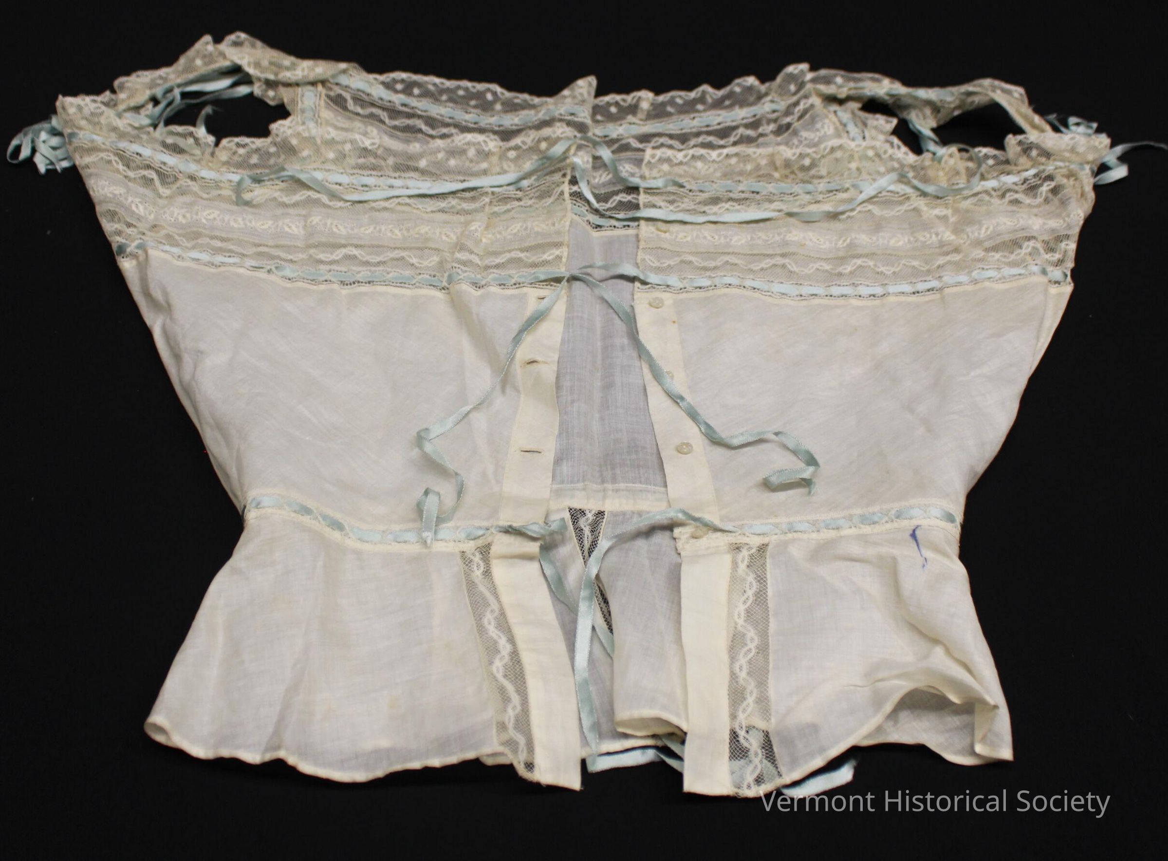 White linen corset cover. The neckline is trimmed with several widths of lace, and the should straps are formed from lace. Light-blue ribbon is threaded through lace at the neckline, bust, and waistline to adjust fit. It buttons up the center back with 4 white plastic buttons.