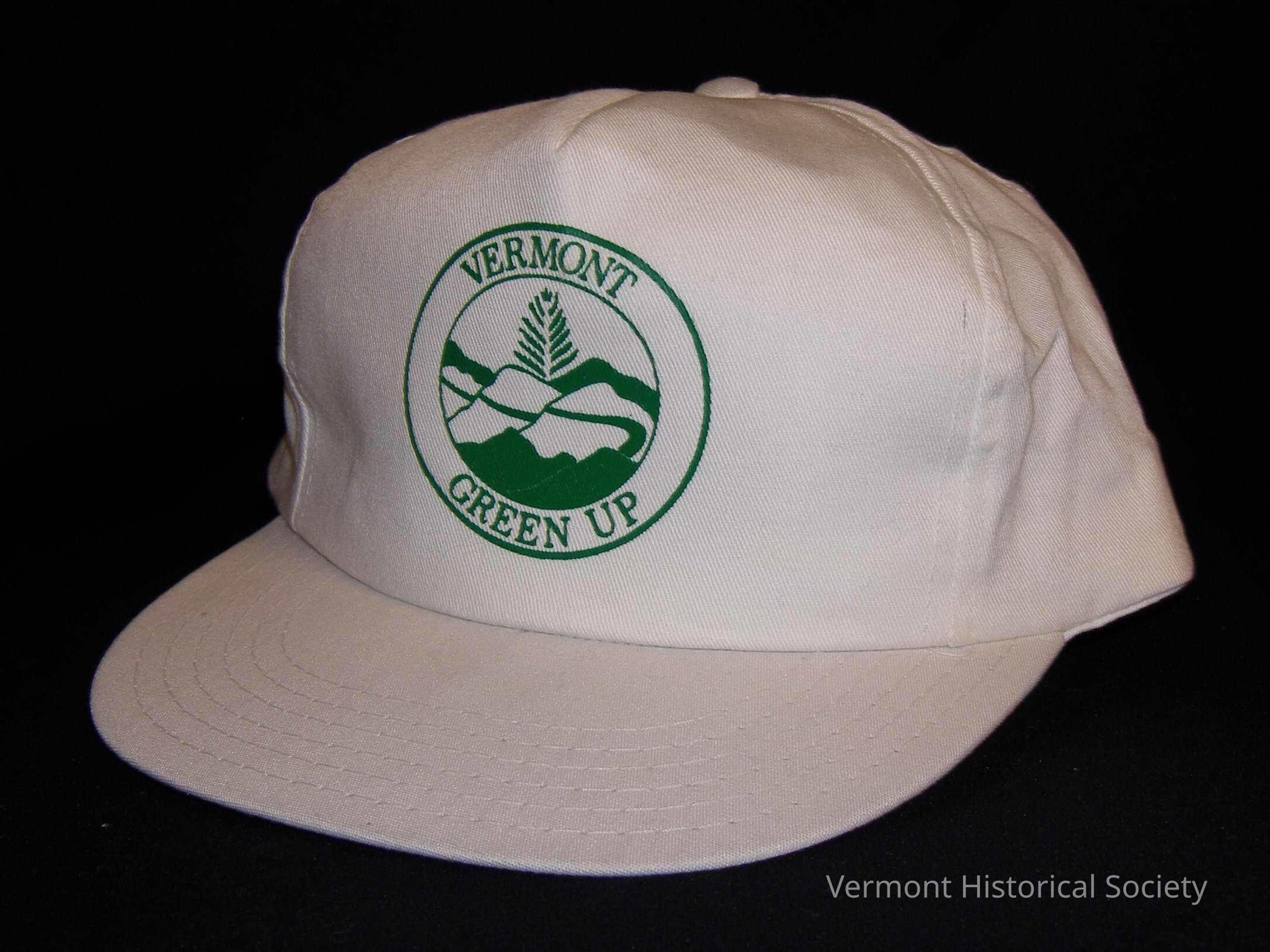 The baseball cap is made of white cotton and features an imprint of "VERMONT GREEN UP" and its logo in green on the front. The cap's inside tag displays "AD ART AMERICA," and on the reverse side, it reads "PRINTED BY HAND IN VERMONT 802-476-5226." To ensure a proper fit, the cap includes a plastic band in the back for adjusting the size. The brim of the cap extends out 3 inches and has a green facing. It is topstitched using wide stitching.Acquisition