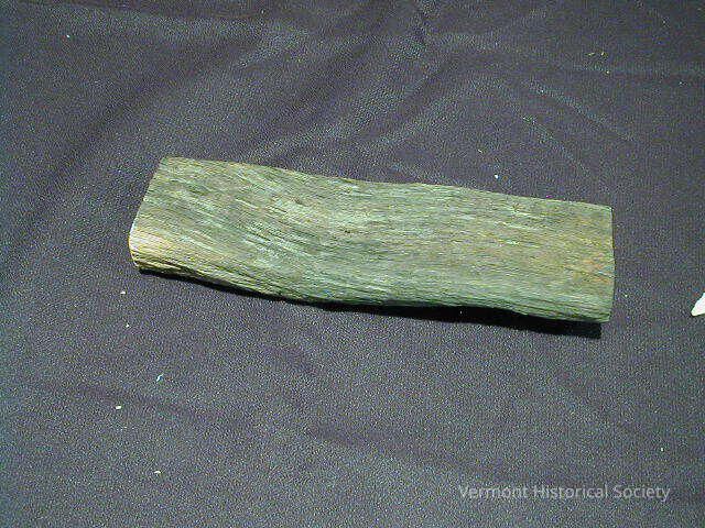 Rectangular wood fragment. The long ends are rounded, but the short ends are clean cut. One short end is labeled, "Royal Savage", in pencil.Context