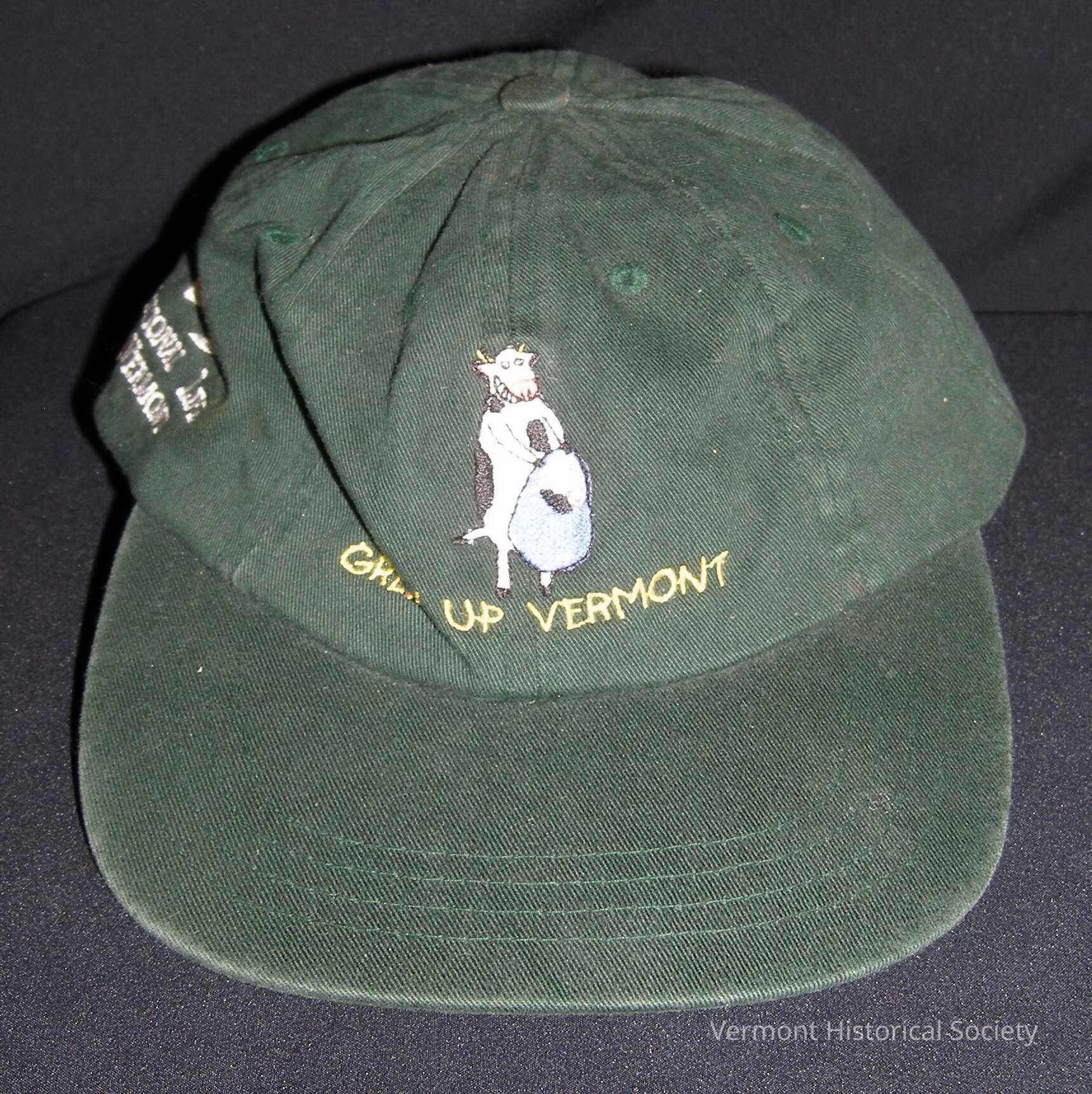 This baseball cap is made from dark green cotton and prominently displays a stitched logo on the front. The logo features a cow holding a trash bag, symbolizing environmental consciousness. Below the logo, "Green Up Vermont" is stitched in yellow letters, further emphasizing the environmental message. On the right side of the cap, in white lettering, is the stitched text "National Life of Vermont." Across the back of the cap, also in white lettering, is the phrase "Vermont Chamber of Commerce." The cap's visor extends out approximately 2.75 inches. At the back of the cap, there is a cotton band and buckle, allowing for adjustment of the cap's size. Inside the cap, a label reads: "Kati headwear SUPREME One size fits all made in China."Acquisition