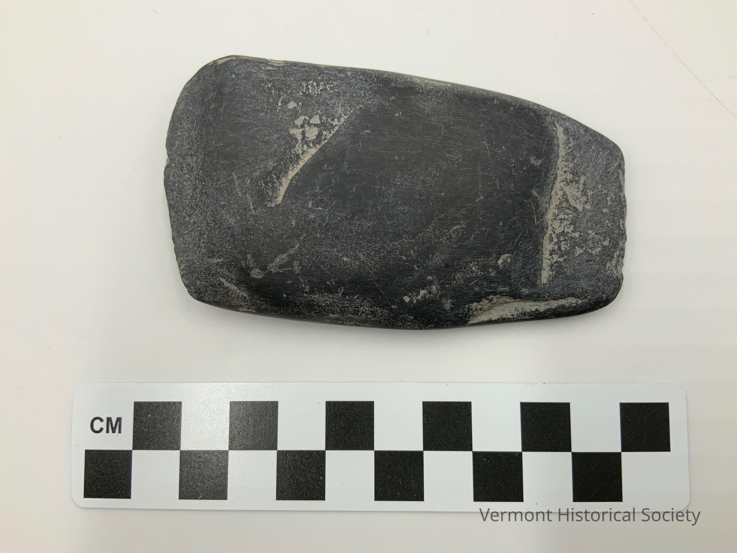 Ground stone celt made of hornfels. The surface is completely ground and polished, and the side edges are beveled. The distal edge is sharp, and the proximal edge appears thinned.Context