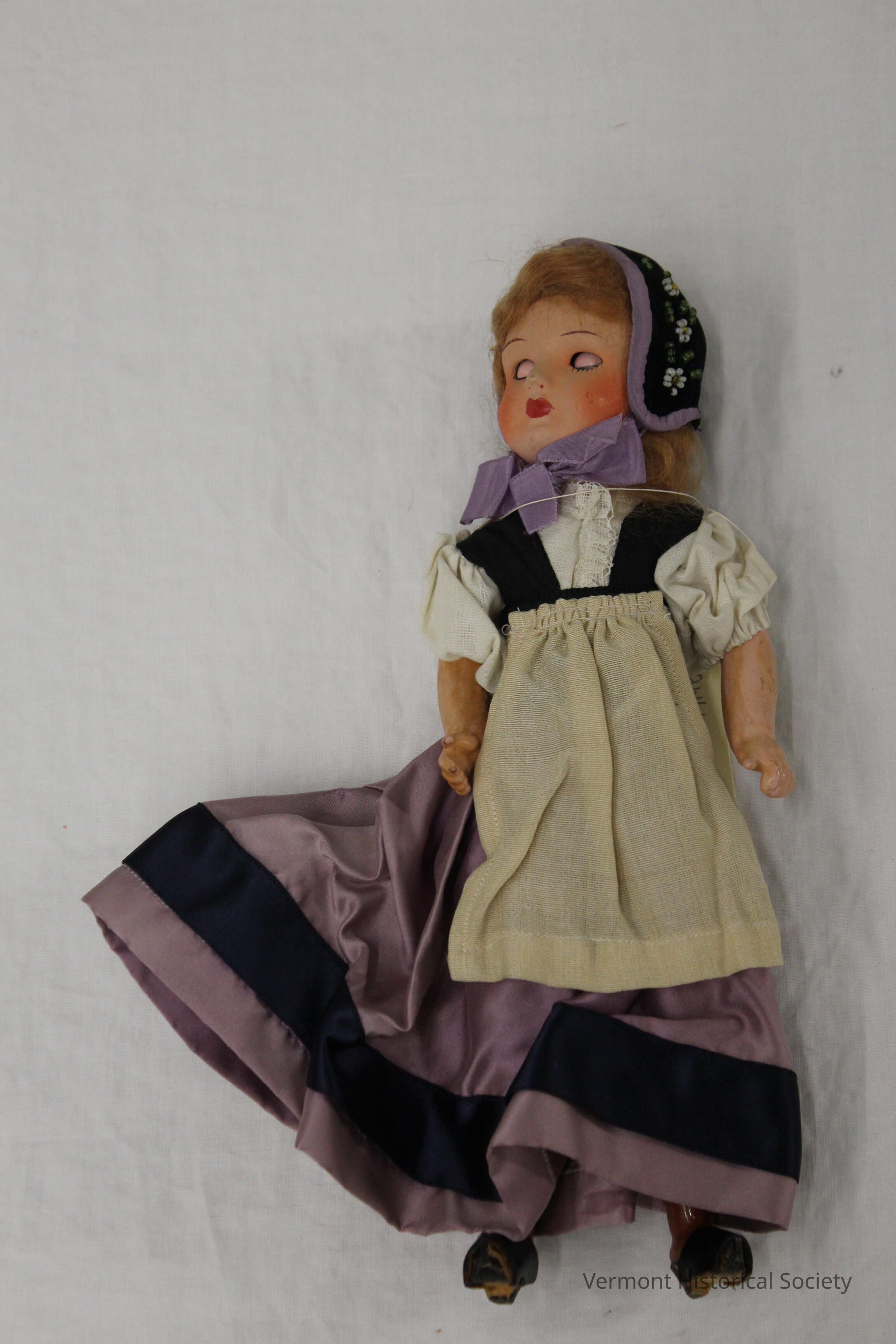 Doll in lilac skirt with with ribbon trim, cream apron, white blouse with stain on back of one sleeve, black decorated cap with lilac ribbon ties, red hair, two black clogs, discolored paint.Context