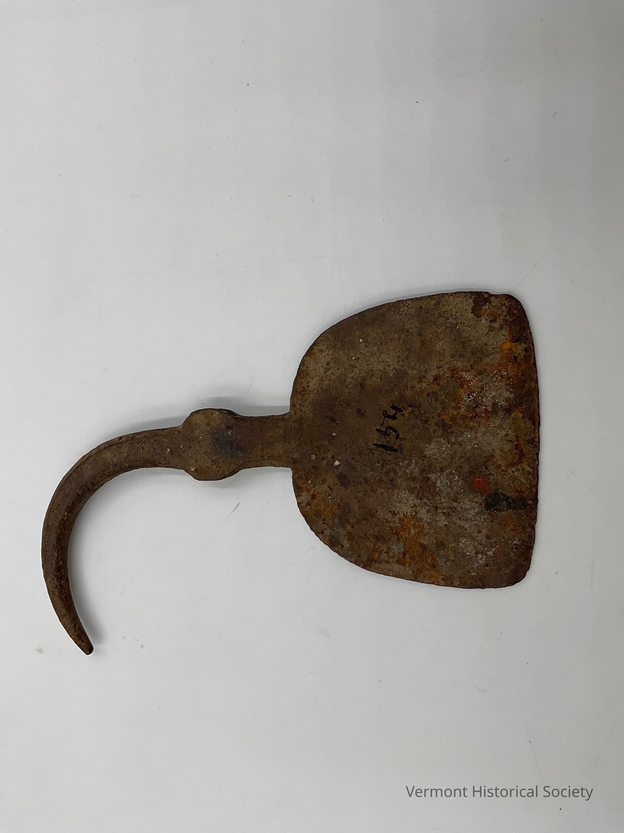 Iron ax head with spatula-shaped blade, a small opening for a handle, and a curved, pointed hook. From a collection assembled by Harry Woodcock.Context