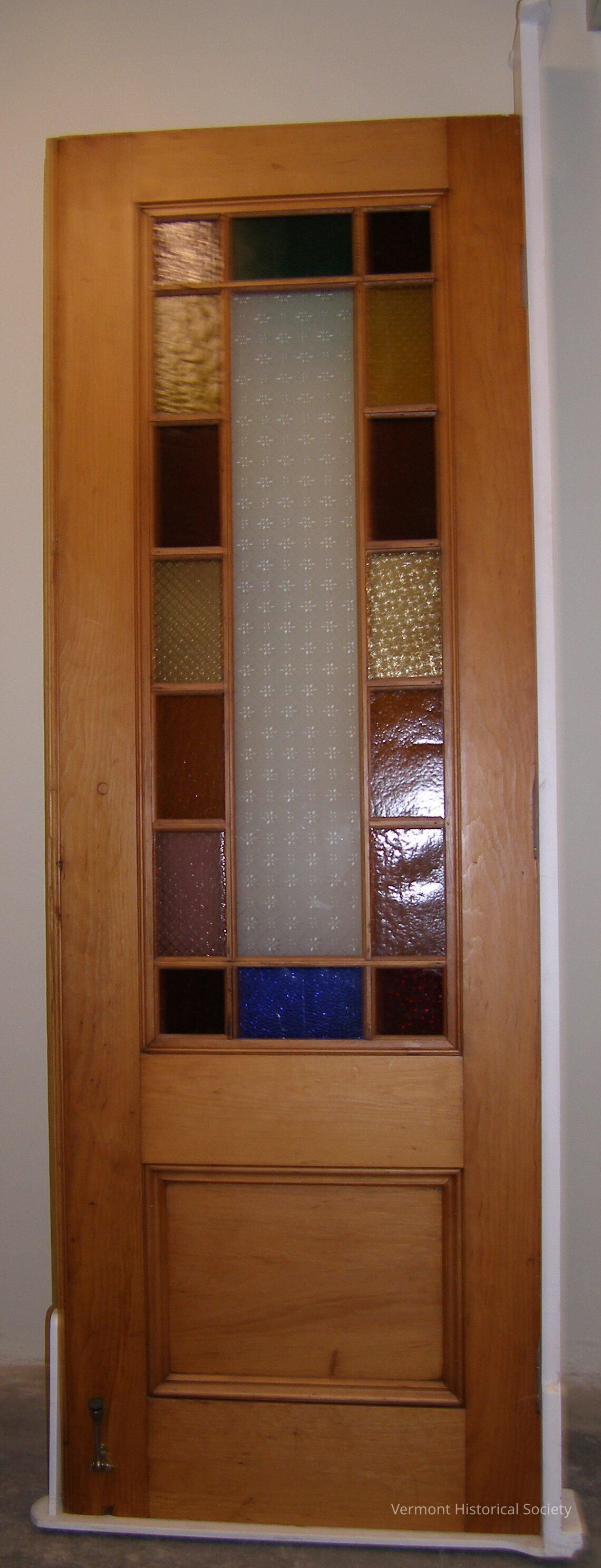 Wooden door with rectangular stained-glass window. The widow stretches across the upper 2/3 of the door and consists of a clear central panel etched with starbursts surrounded with rectangular panes of colored and textured glass.