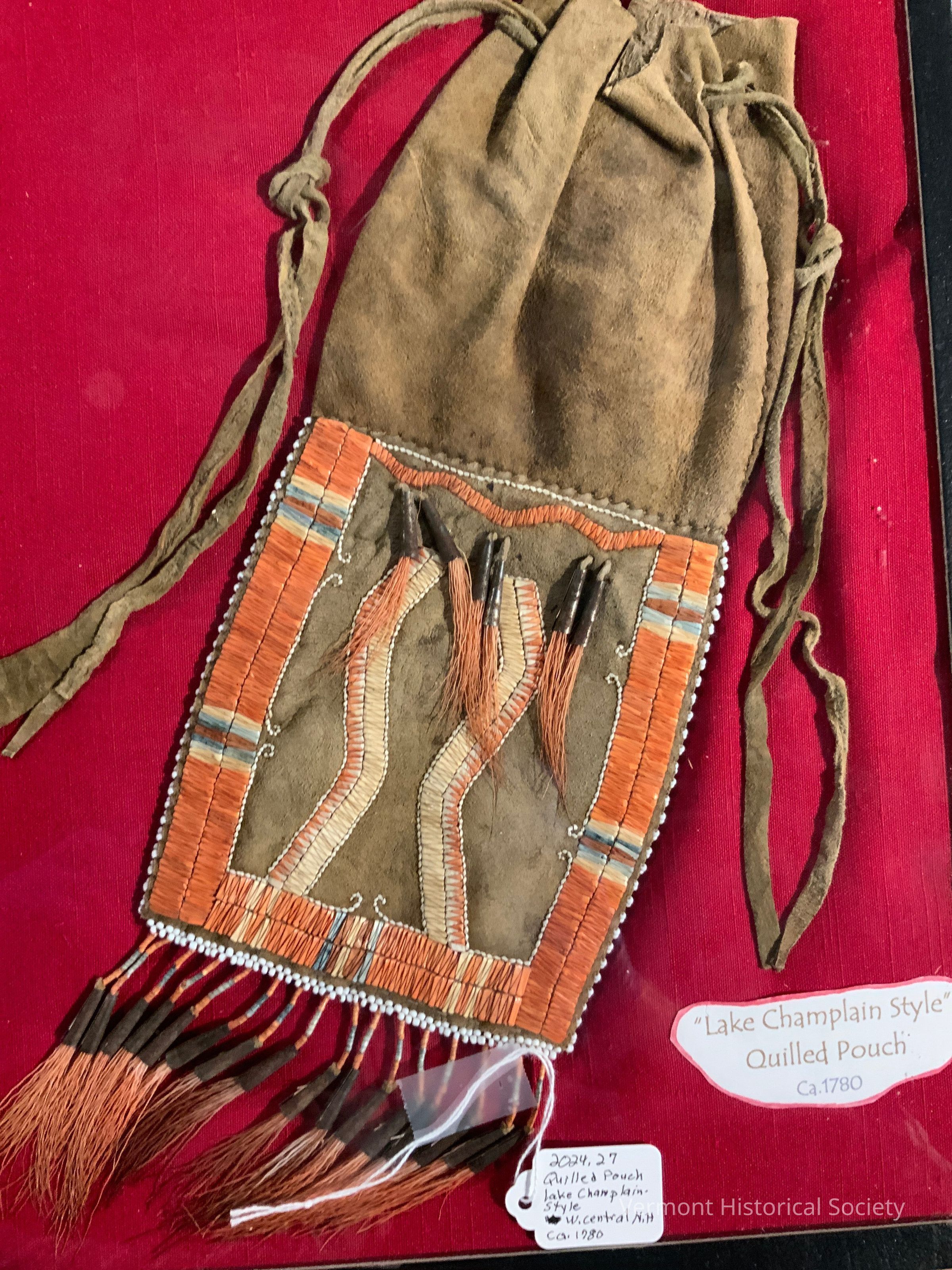 Hide pouch with drawstring closure. Decorated with dyed porcupine quills sewn onto the surface of the lower half of the pouch. Red, white, and blue border surrounds two white and red zig-zag vertical forms. Inner edge of the border includes beaded, scrolled forms. Six beaded and red hair drops are attached to the surface of the quilled design. Sixteen more drops are attaches to the bottom seam.Context