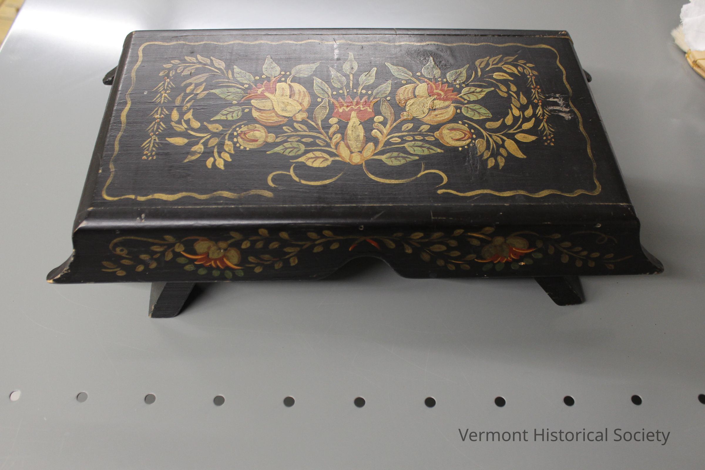 Small wooden footstool. The stool is painted black with painted floral decoration, similar in design to toleware. A sticker on the back reads, "Hand-painted BY THOMAS F FITZSIMMONS WESTON, VERMONT".