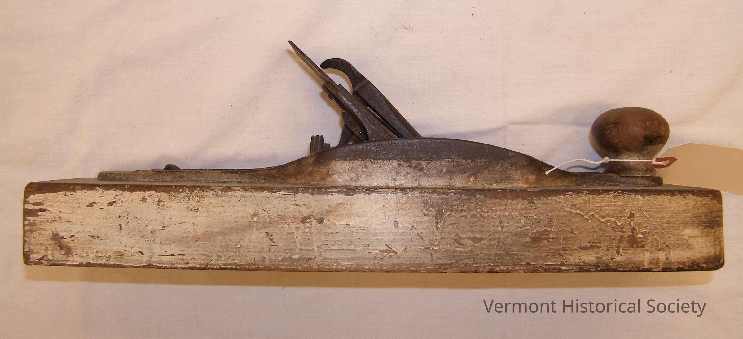 Bench plane consisting of a metal woodworking plane imbedded into a white painted wooden board.