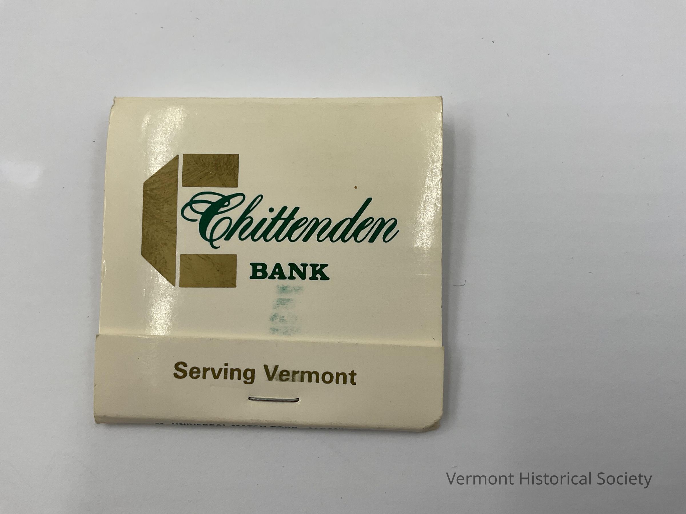White matchbook with gold and green logo for "Chittenden Bank." A warning is printed at the bottom of the cover that says, "Be safe, Close cover before striking." On the back is the message, "A complete banking service" printed in gold and boxed in green. On the inside of the cover is a list of the banks 33 locations in Vermont. There is also a note that says, "Member FDIC, an equal opportunity lender." The flap securing the matches says, "Serving Vermont." Each match has a message printed vertically in green such as "safe deposit boxes", "personal loans" and "iscount brokerage." The manufacturer, Universale Match Corp. Albany, N.Y., is listed on the bottom edge.Context