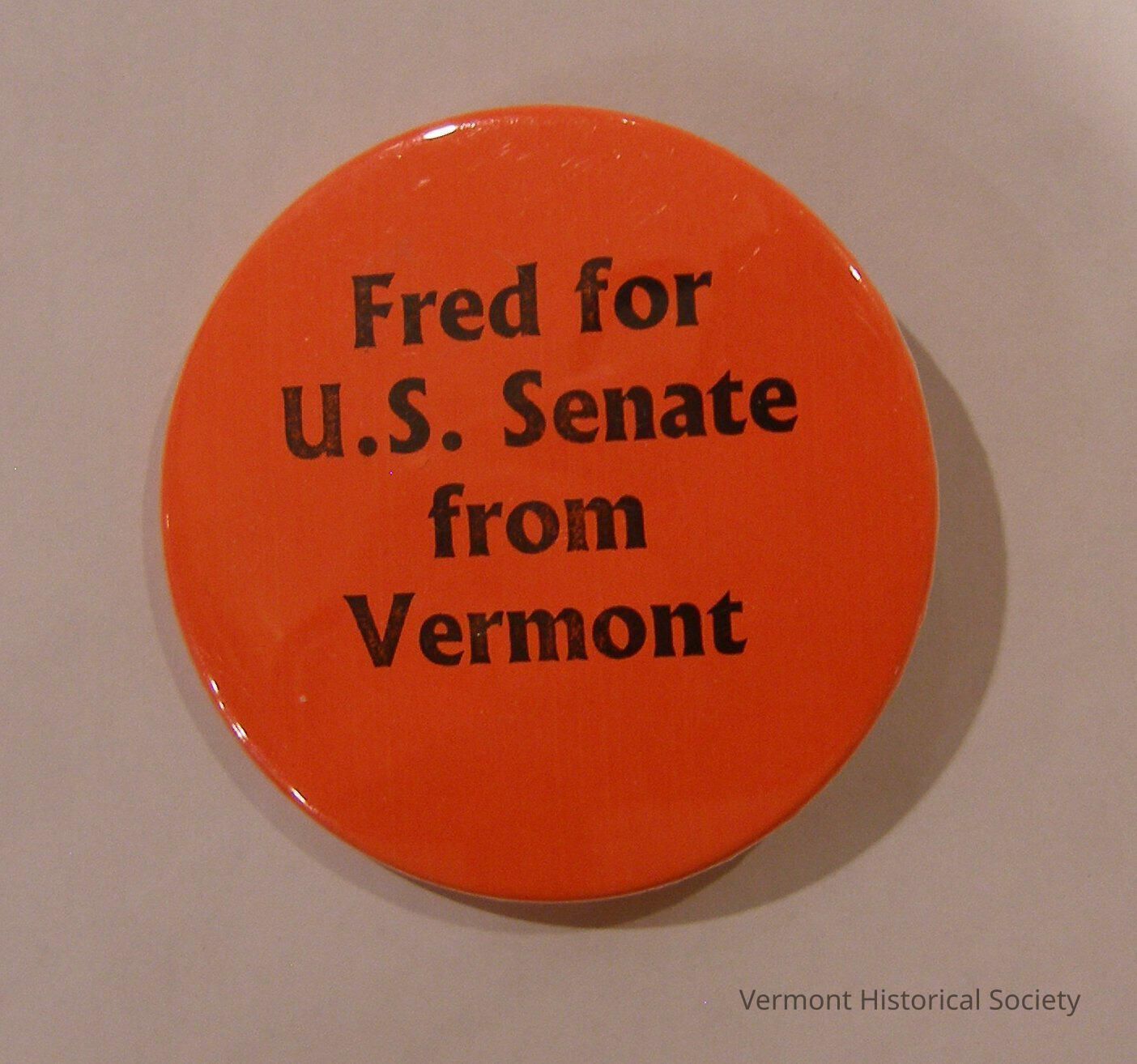 Round orange pin. Written in the center of the pin, in black, are the words "Fred for / U.S. Senate / from / Vermont". A maker's mark is stamped on the back and reads, "BADGE-A-MINIT / 1-800-223-4103".