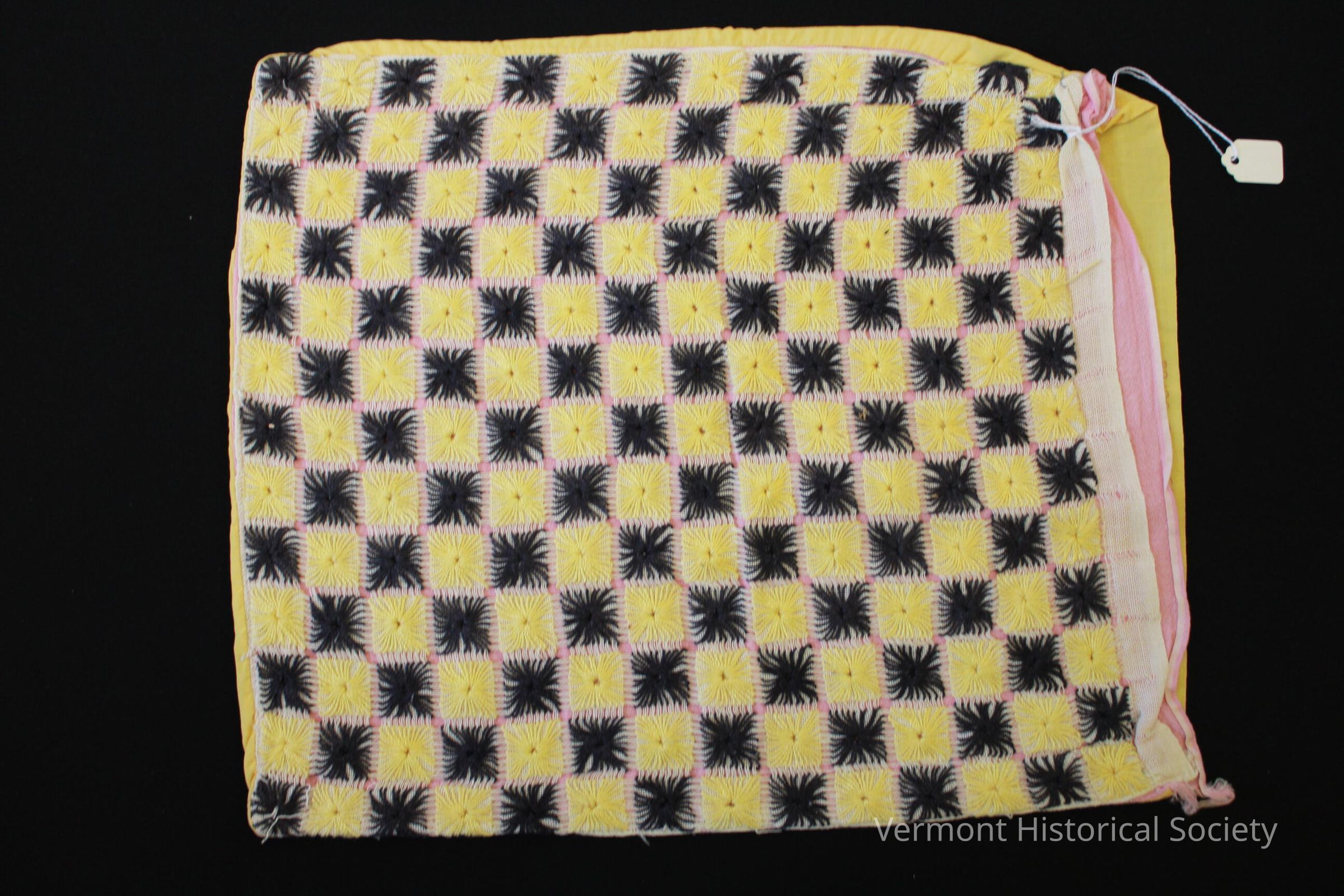 Pillowcase made from three layers. The back layer is yellow, the middle layer is pink, and the top layer is white embroidered with alternating squares in blue and yellow.Acquisition