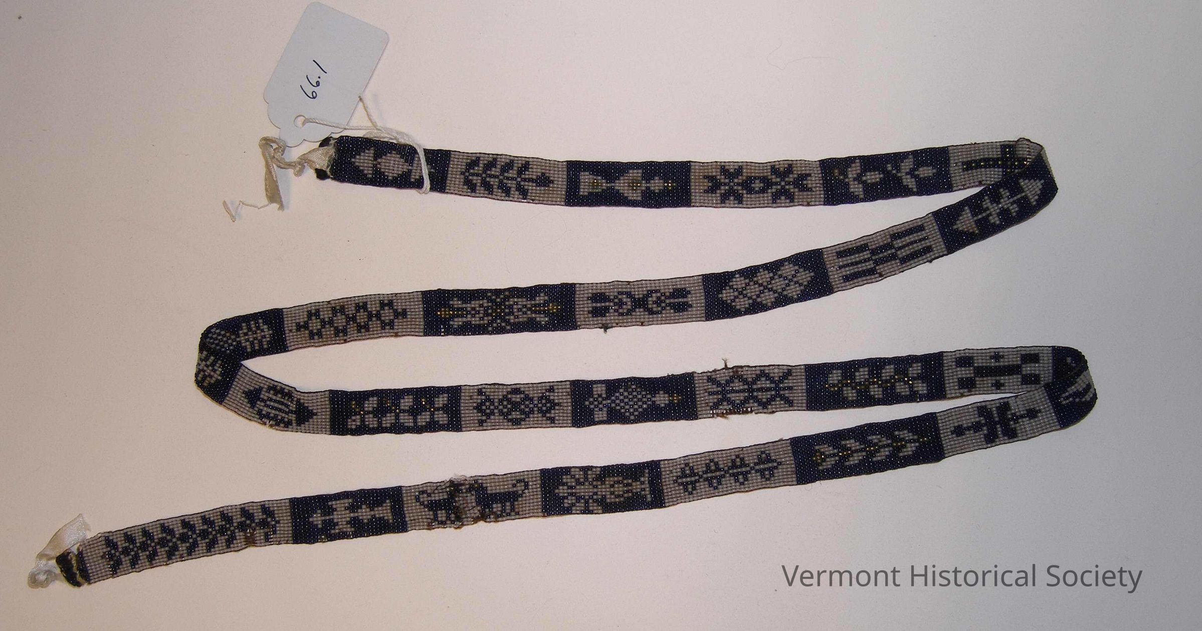 Belt woven with glass seed beads. The design is separated into sections with alternating background colors: white designs on black and black designs on white. Some designs are accented with gold beads. Designs include geometric shapes, plants, a cross, flowers, and animals. The belt is unlined, leaving the design visible on both sides.Context