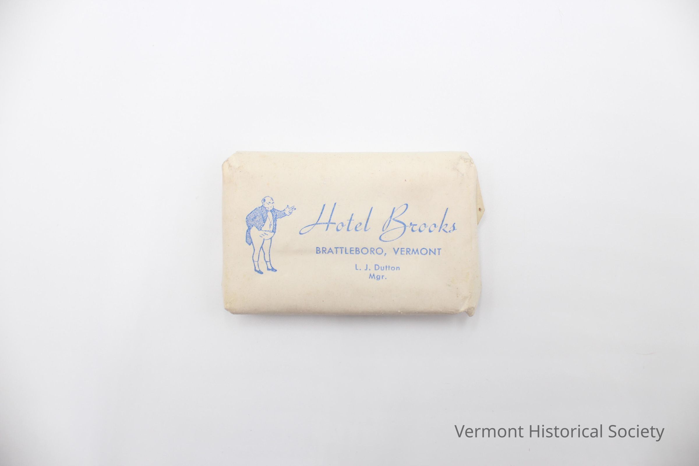 Small bar of ivory soap wrapped in white paper. The front of the wrap has an image of a portly man wearing a dark coat with tails who is gesturing toward the inscription "Hotel Brooks BRATTLEBORO, VERMONT L. J. Dutton/mgr." The back of the wrap bears the inscription, "IVORY".Context