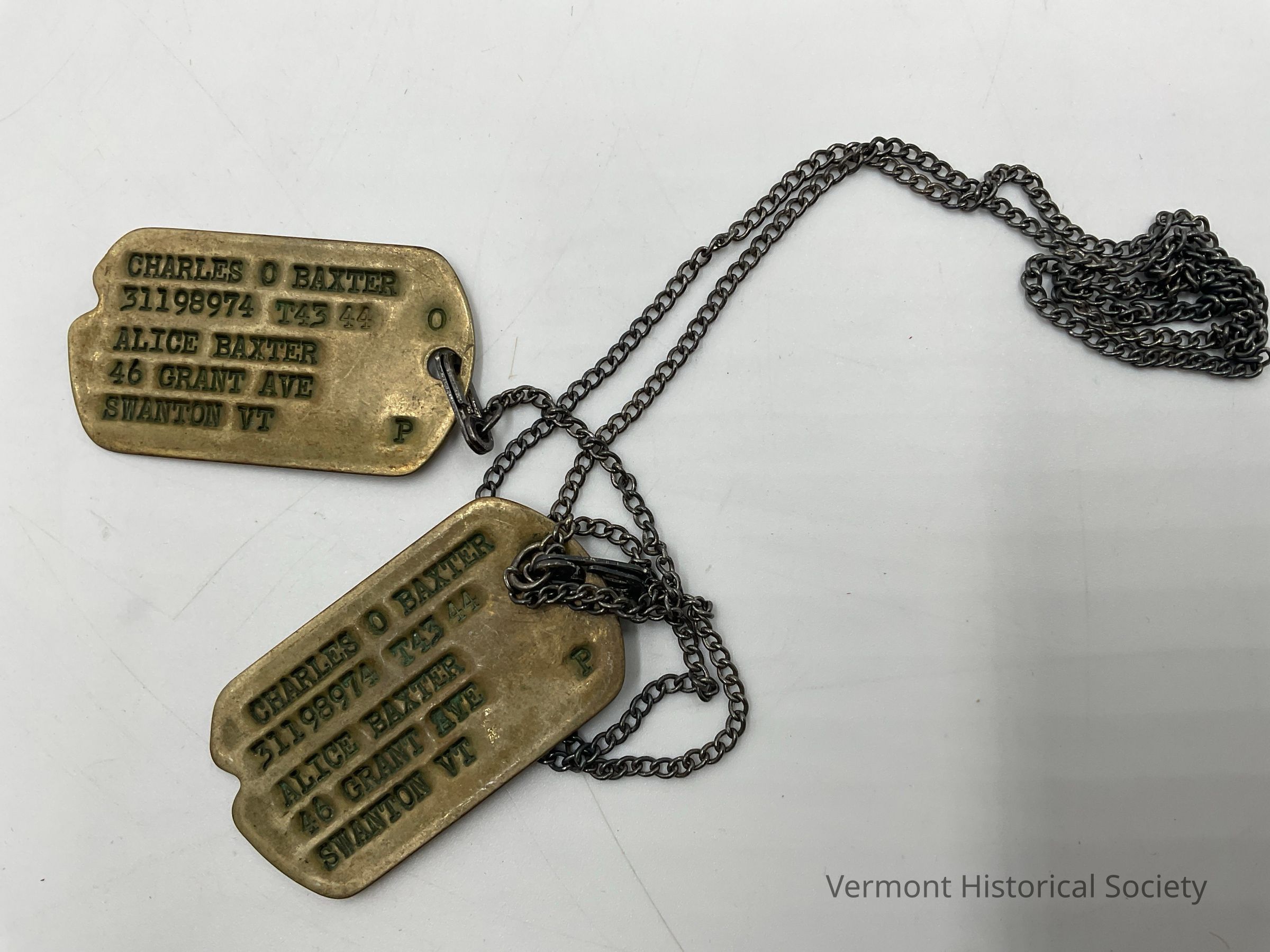 A chain with two "dog" or military identification tags worn by soldiers in World War II. This tag reads, "Charles O. Baxter, 3119874 T43 44 Alice Baxter, 46 Grant Ave. Swanson VT." On the edge is a letter O and lower, a letter P.Context
