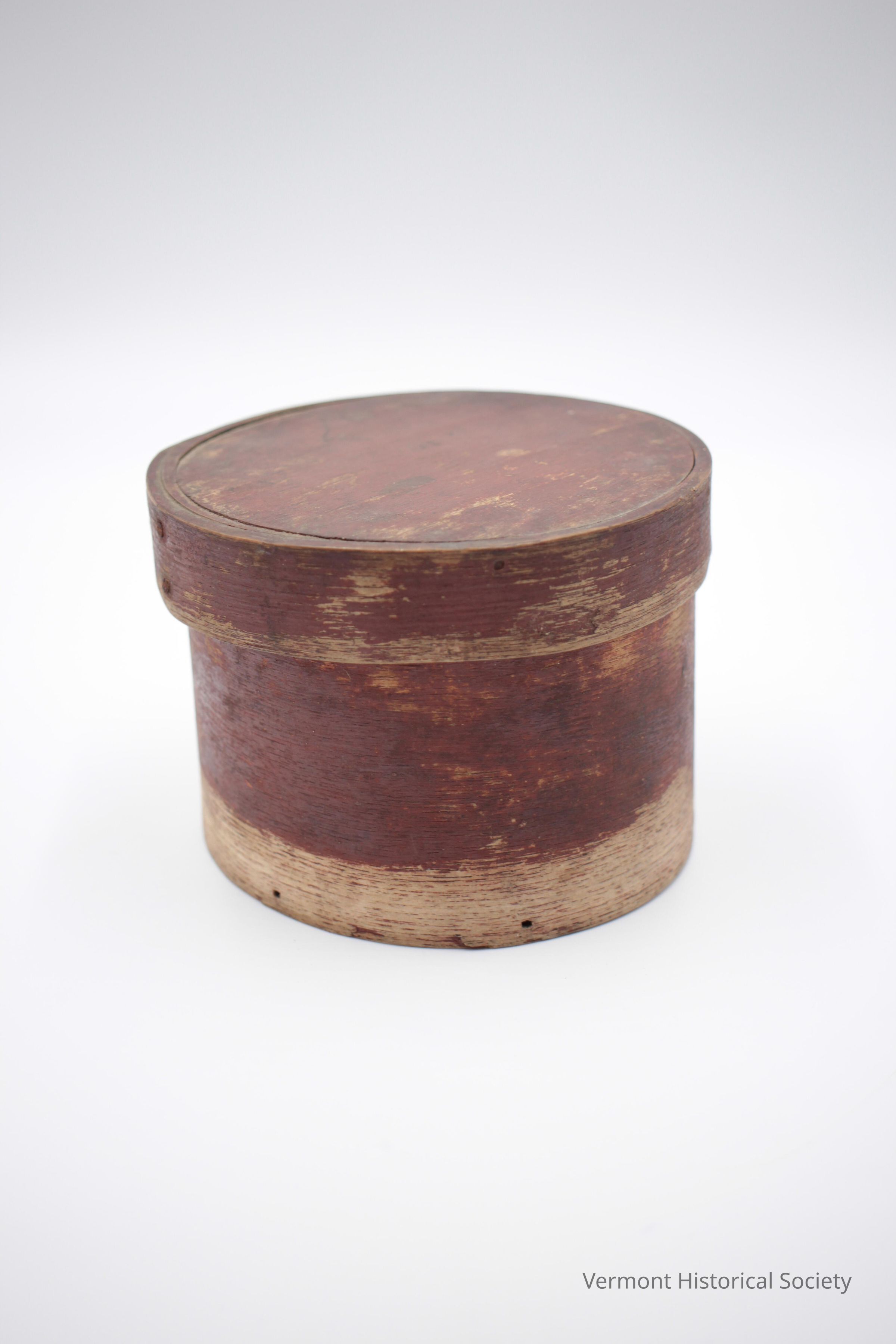 Small round wooden box with red paint. The sides are formed from a thin strip of wood nailed together at the seam with small nails.