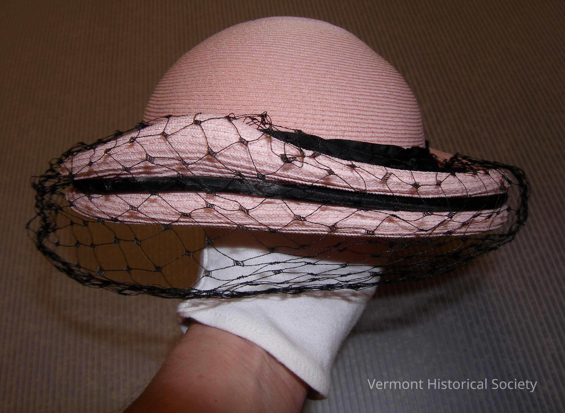 This pink straw hat features a rolled brim with a black grosgrain band encircling the crown. There is black grosgrain piping along the brim. Attached to the sides of the hat is a black veil that extends over the front. The inside of the crown is adorned with a pink grosgrain ribbon. A tag is present, with the inscription "New York Creation adjustable."Context