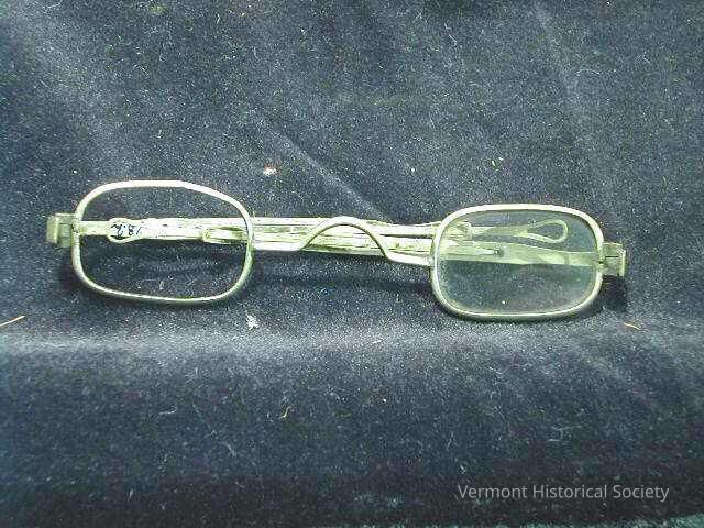 Metal framed eyeglasses with small, clear rectangular lenses. The temples are constructed in 2 pieces and extend outward to lengthen.