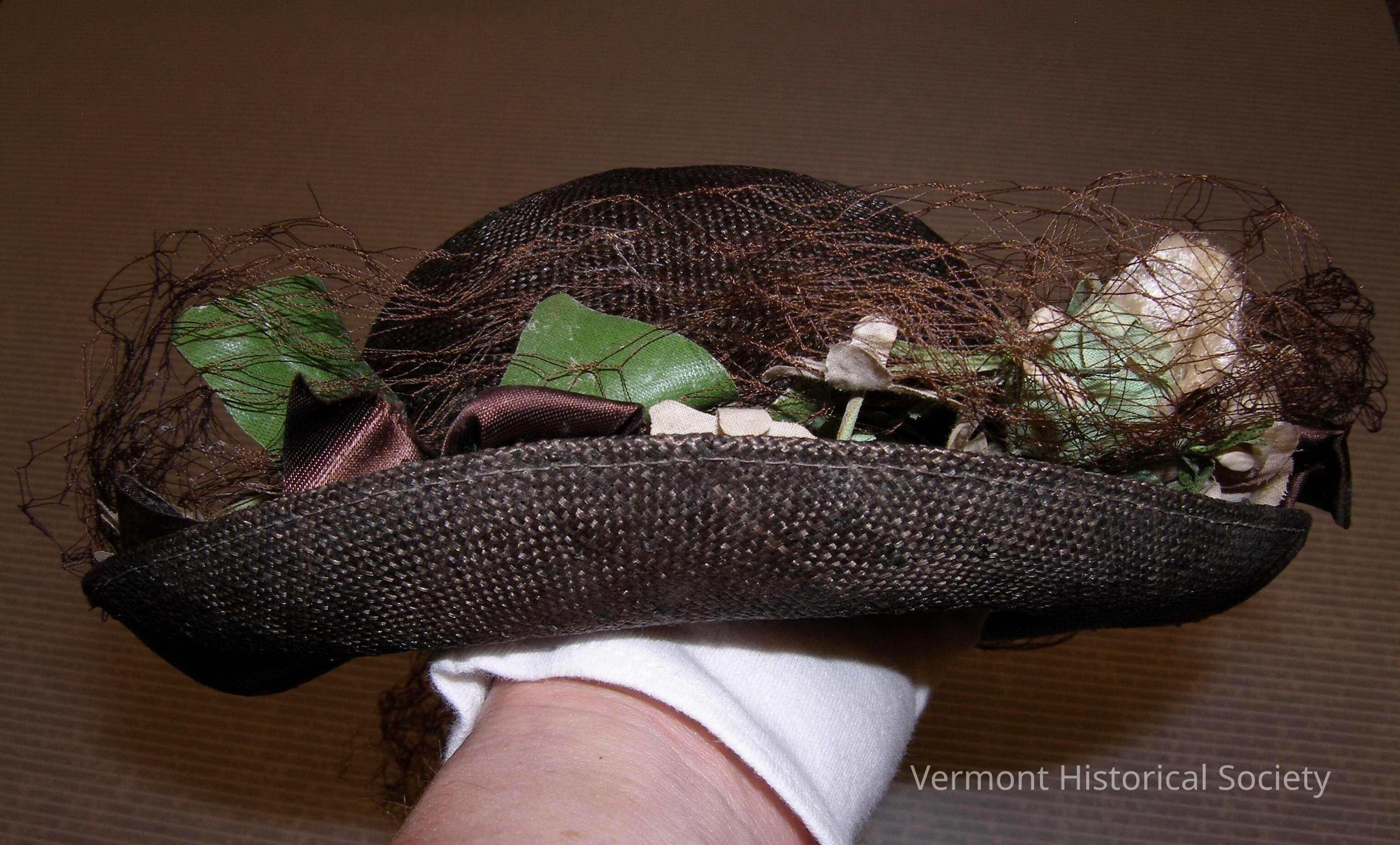 Brown straw hat with floral and satin ribbon trim on the front and a brown veil around crown that ties in the back. The hat has a narrow, upturned brim. A tag on the inside reads, "New Town Creation 22."Context