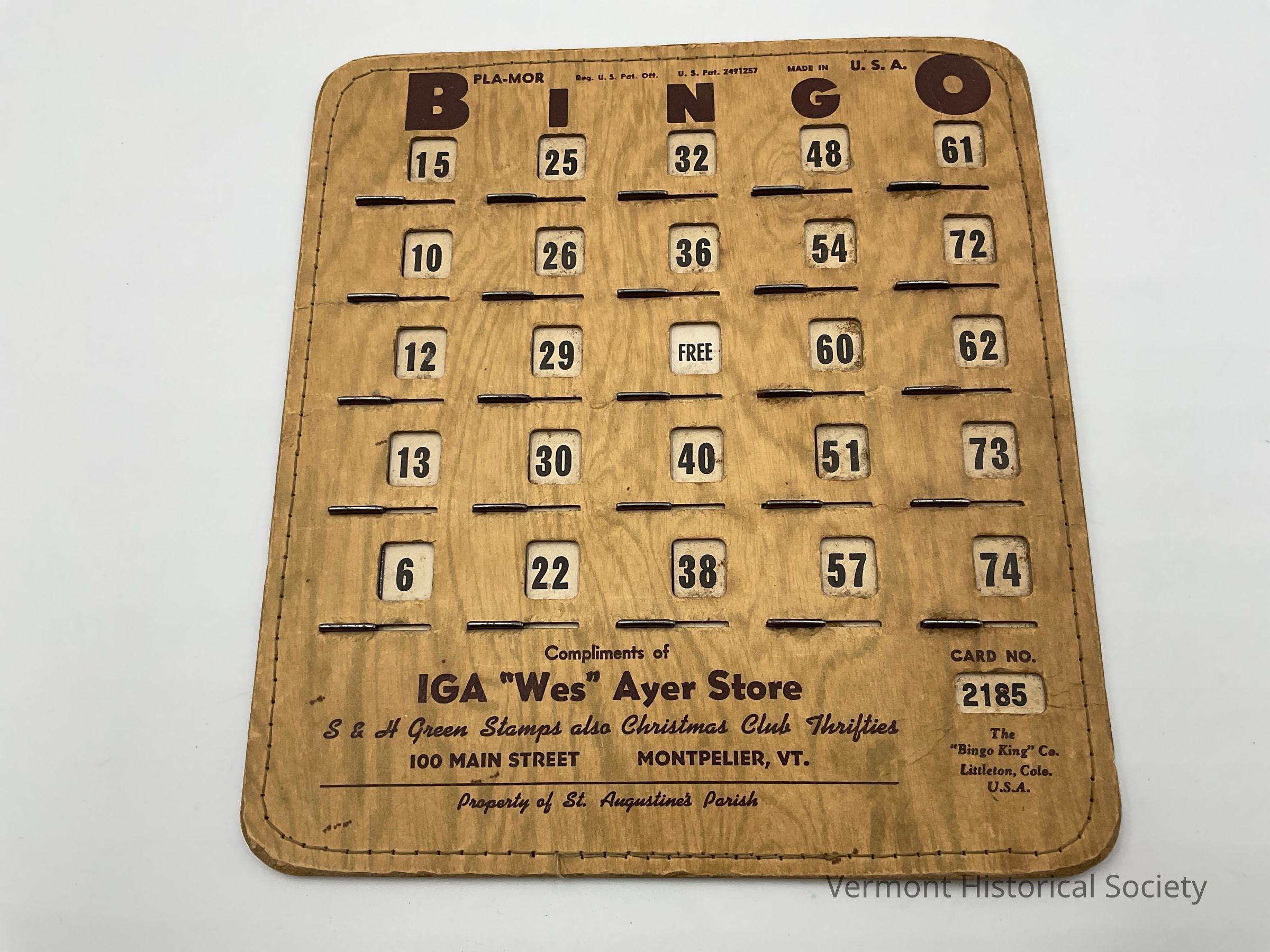 Cardboard bingo card printed with a faux bois pattern. The card has 26 windows carved into the face that show paper numbers beneath. 24 of the windows show 2-digit numbers, 1 shows the word "FREE", and 1 shows a 4-digit card number. The bottom of the card is printed with an advertisement for IGA "Wes" Ayer Store in Montpelier, Vermont.