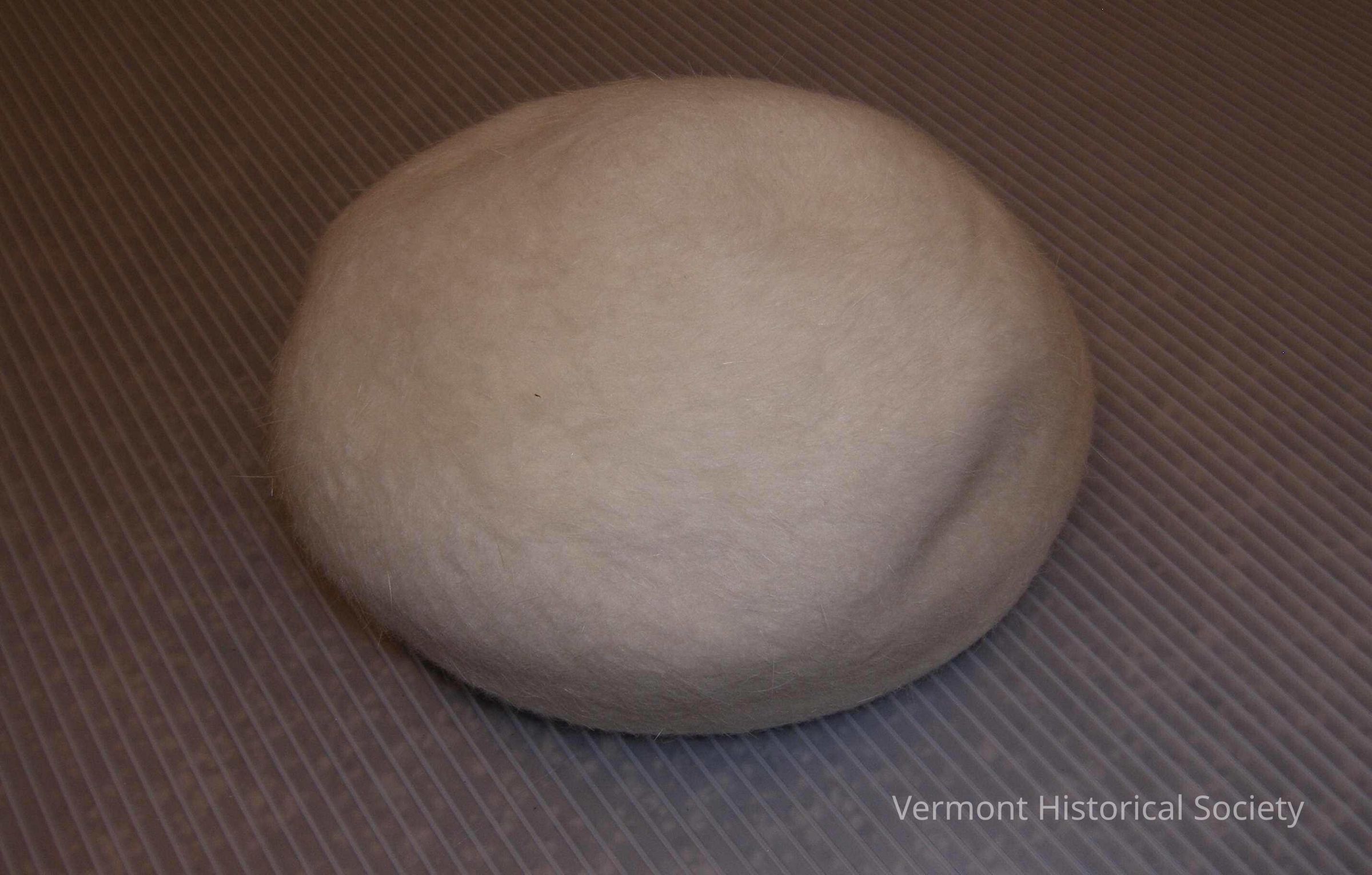 White felted wool beret. There is a grosgrain ribbon around inside of crown and paper tape on the ribbon that reads, "Sanitape your guarantee of freshness". The center of the crown's interior is printed with the label, "PANDORA body made in Italy".Context