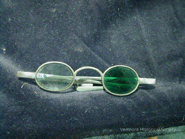 Metal framed eyeglasses with oval lenses. One lens is clear and not fitted to the frames. The other lens is green and has a diagonal crack from the center top to the outer edge.