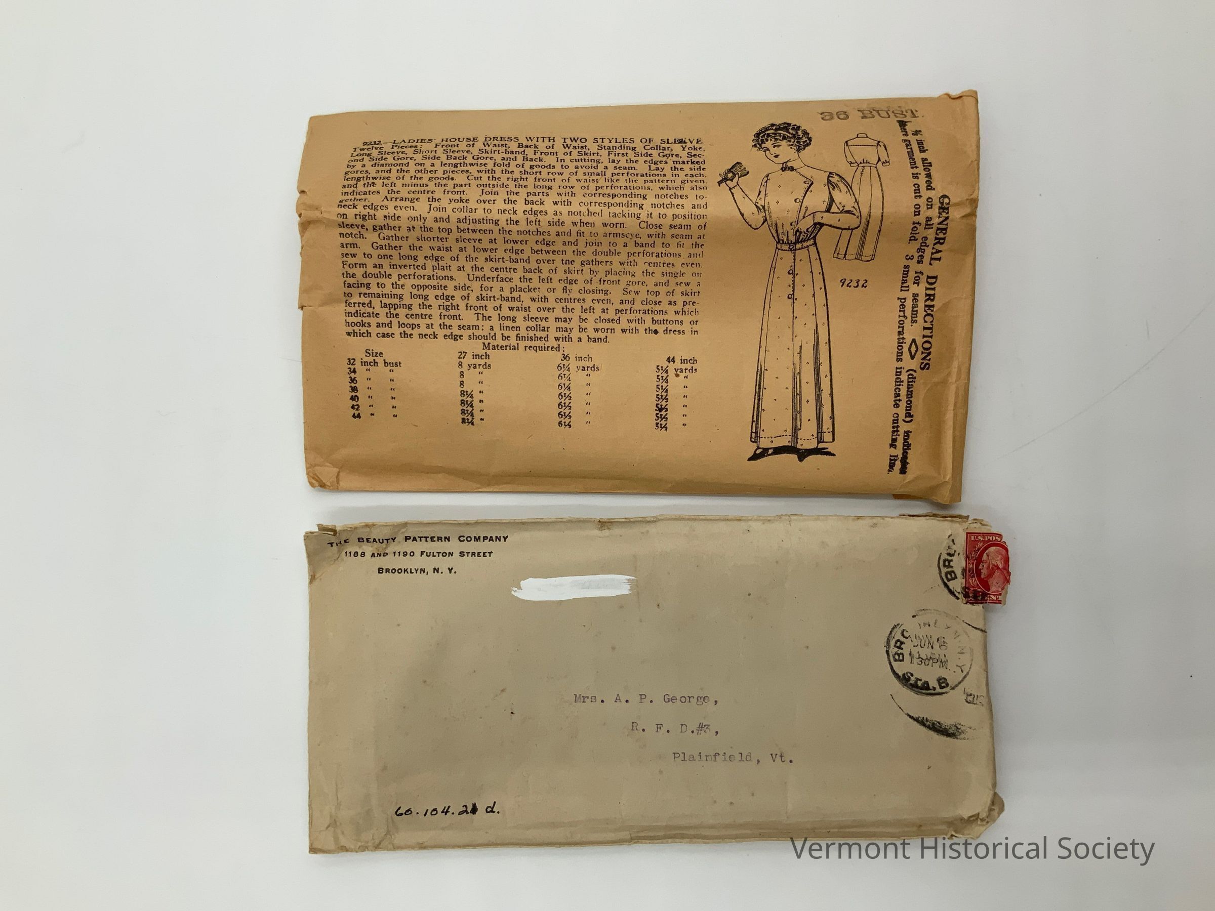 Cut tissue paper sewing pattern in a commercial envelope. The front of the envelope is printed with sewing instructions and an illustration of the finished garment. The garment is a dress with an long sleeves and an off-center front opening ("Ladies' House Dress with Two Styles of Sleeve"). The pattern and commercial envelope were inserted into a mailing envelope addressed to "Mrs. A. P. George, R. F. D. #3, Plainfield, Vt." and returned addressed from "The Beauty Pattern Company 1186 and 1190 Fulton Street, Brooklyn, N. Y."Context