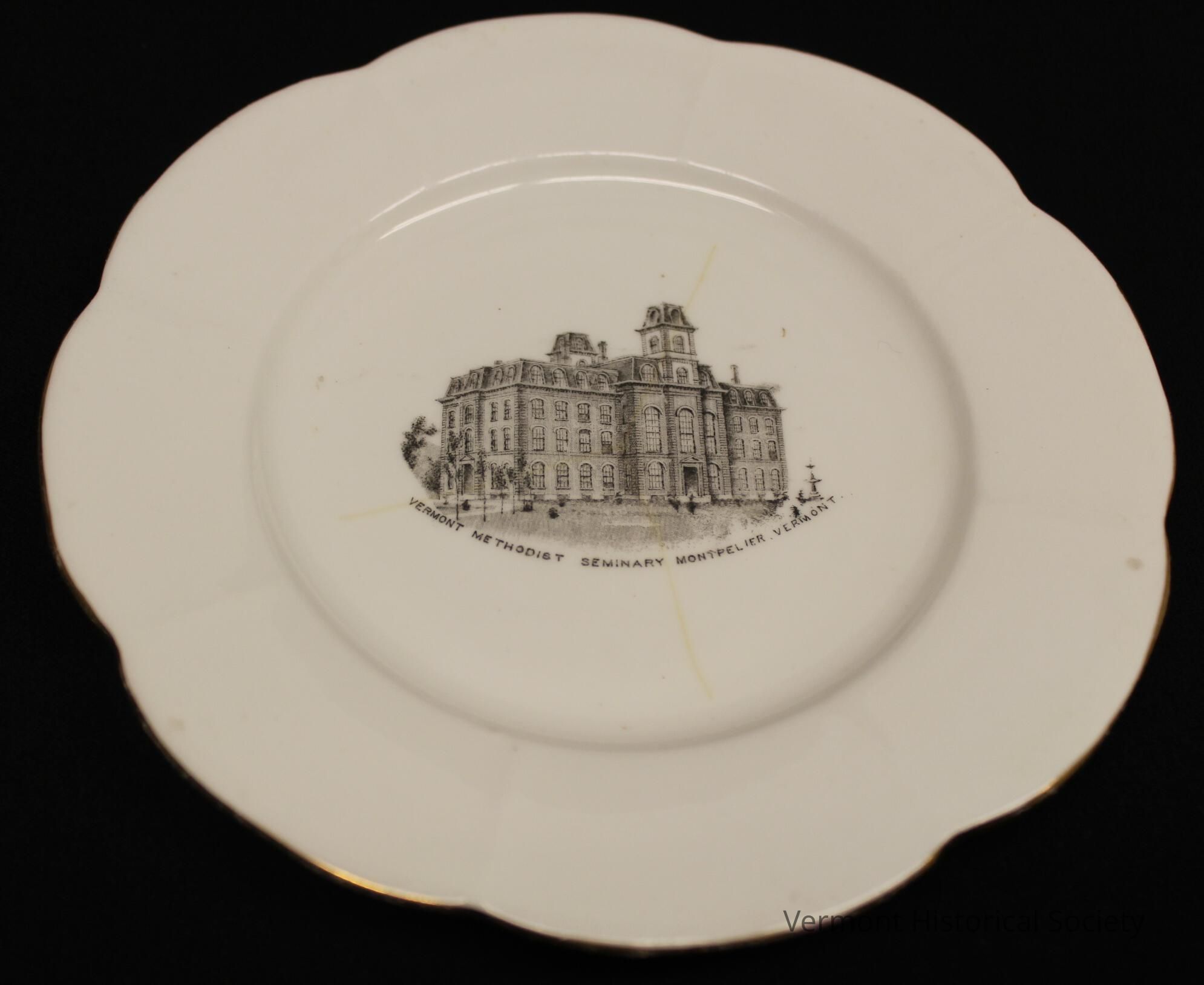 White souvenir saucer with scalloped edge, trimmed with gold. The center shows a large, Victorian building with square tower at the center front and back. The image is labeled, "VERMONT METHODIST SEMINARY MONTPELIER, VERMONT." On the back is the label, "Made in England/Marvin & Sherburne, Montpelier, VT."Context