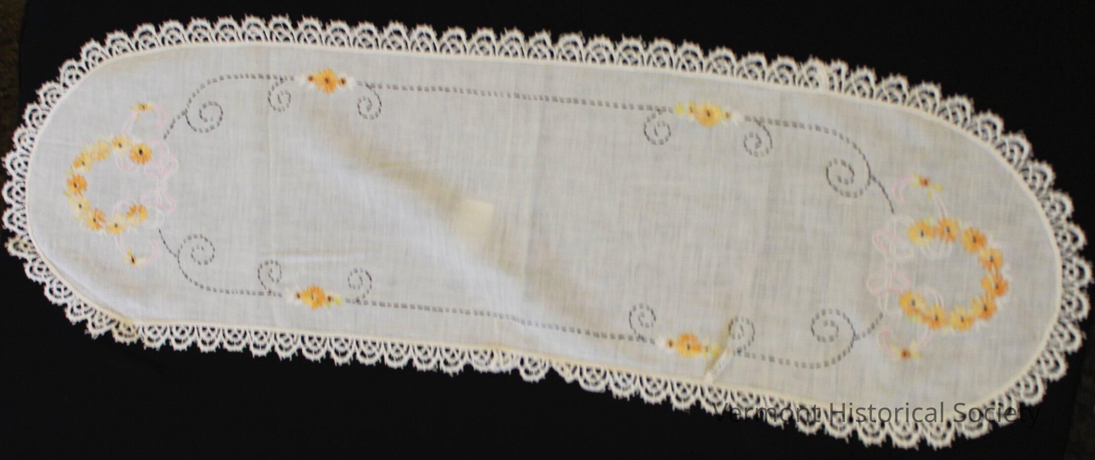 Oval white cotton bureau scarf decorated with openwork and embroidered yellow flowers. The edges are decorated with machine-made tatted lace.