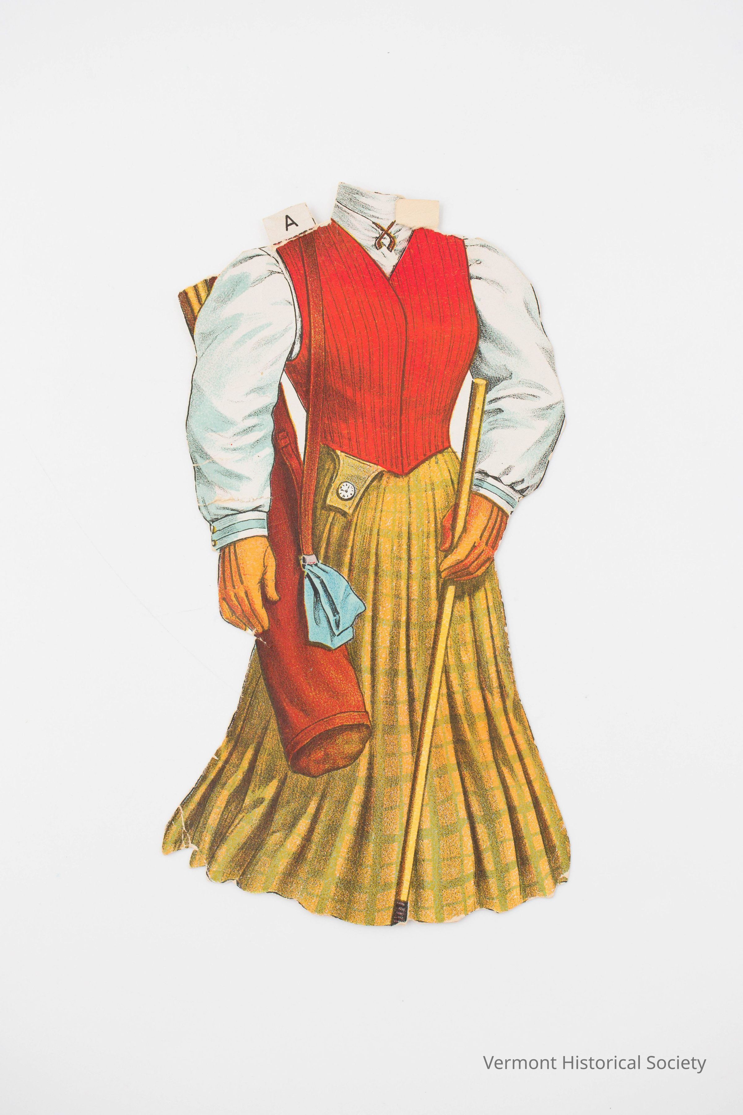 Golfing outfit for a paper doll. The outfit consists of a yellow plaid skirt, red vest, white blouse, and brown gloves. There is a tube strung over the right shoulder, and the left hand is holder a stick.Context