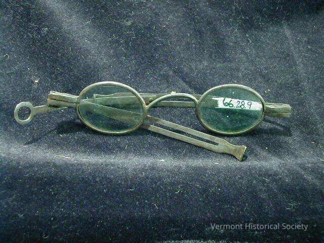 Brass framed eyeglasses with clear oval lenses. The temples extend outward with a pin-and-slot (one damaged) and terminate with a circle.