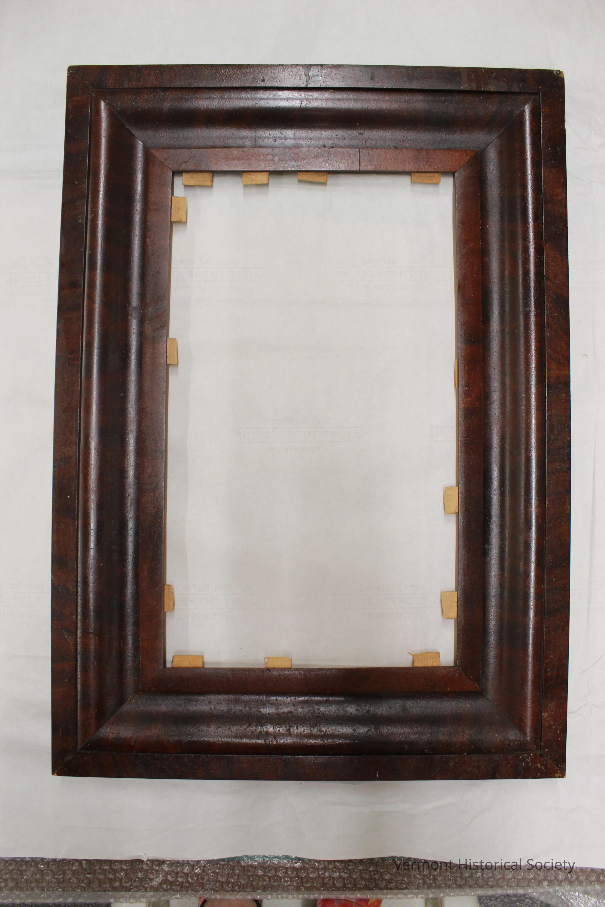 Wide wooden frame with ogee molding and mahogany veneer. The back has a paper label with an image of a large building beside a bridge. Around the image is the inscription, "All kinds of Bedsteads, Tables, Chairs, Sofas, Matresses and Mirrors, Manufactured and for sale Wholesale or Retail, on the best terms, BY A. VN DOORN & SONS, BRATTLEBORO, VT."Context