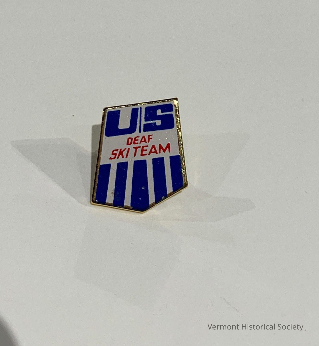 Angular shield-shaped pin. The pin has a white enameled ground with "U|S" in royal blue at the top and the same blue vertical line decoration at the bottom. In the middle of the pin are the words, "DEAF / SKI TEAM" in red. The pin has a straight bar backing to affix to fabric.