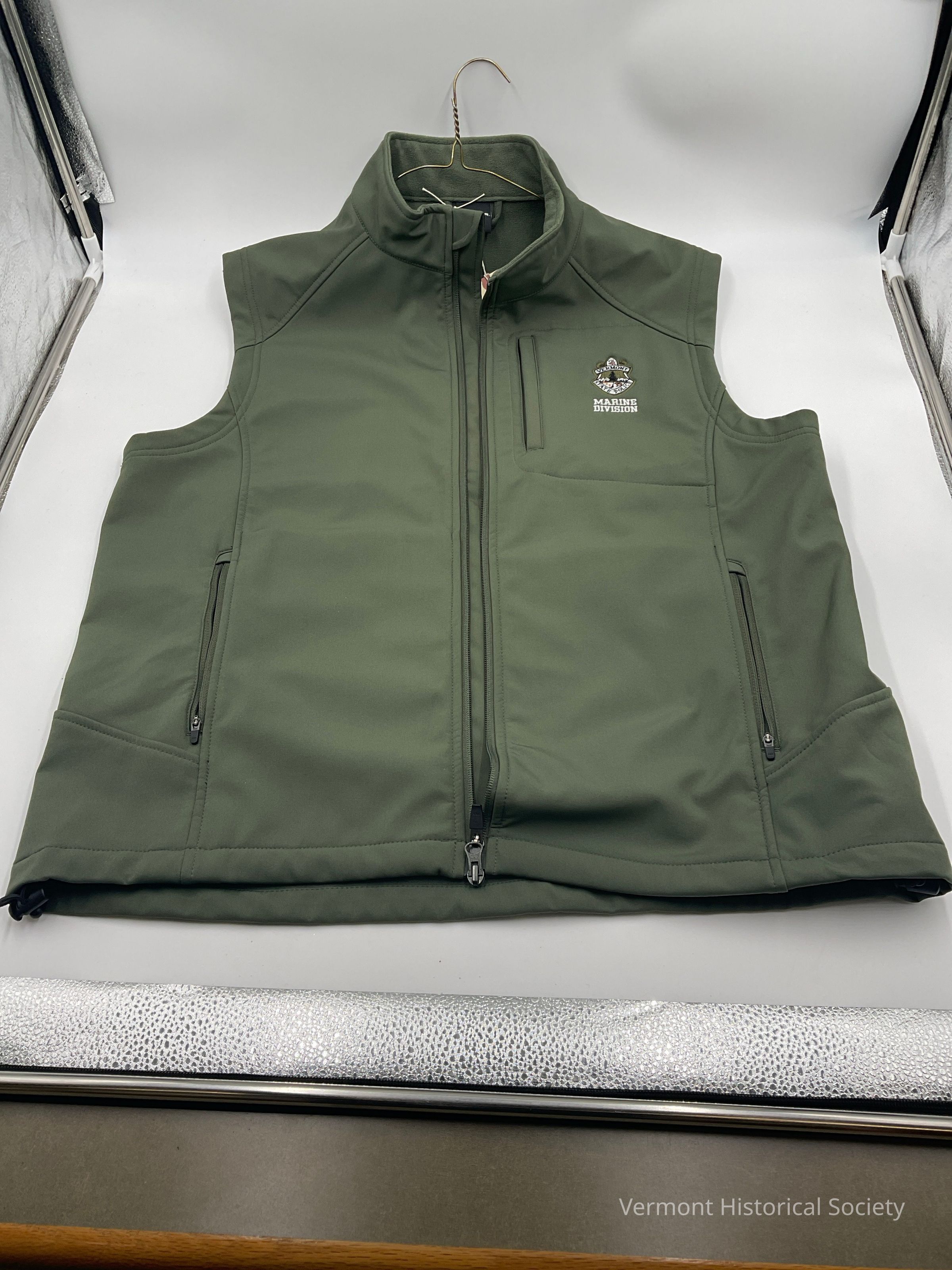 Olive green uniform vest. The vest zips all the way up the front and has a short collar. The vest interior is a light flannel while the outer layer is a slightly sturdier windproof shell. There is one zipper pocket at each side of the waist and a breast pockets on the wearer's left side. Embroidered on the breast pockets is the logo for the Vermont State Police Auxiliary Troop in black, olive, and white, and the words "MARINE DIVISION" in white below the image.Context