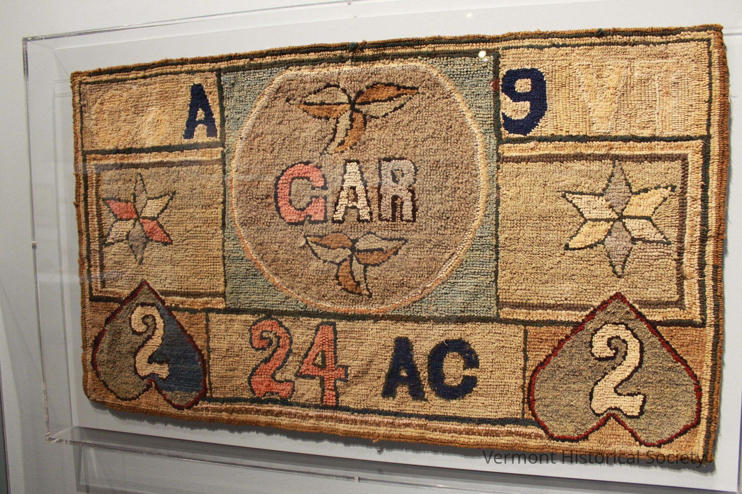 Cotton and wool hooked rug. It is designed in segments, with a circular emblem at the top center with the initials "GAR". The circle is flanked by the letter A and number 9, and 2 6-pointed stars. At the center bottom is the label, "24 AC" flanked by 2 upside-down hearts with the number 2 in the center.Context