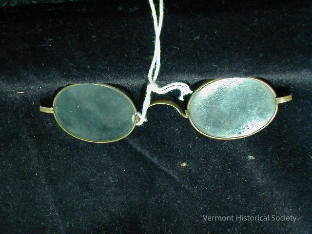 Metal framed eyeglasses with clear oval lenses. The temples are no longer present.