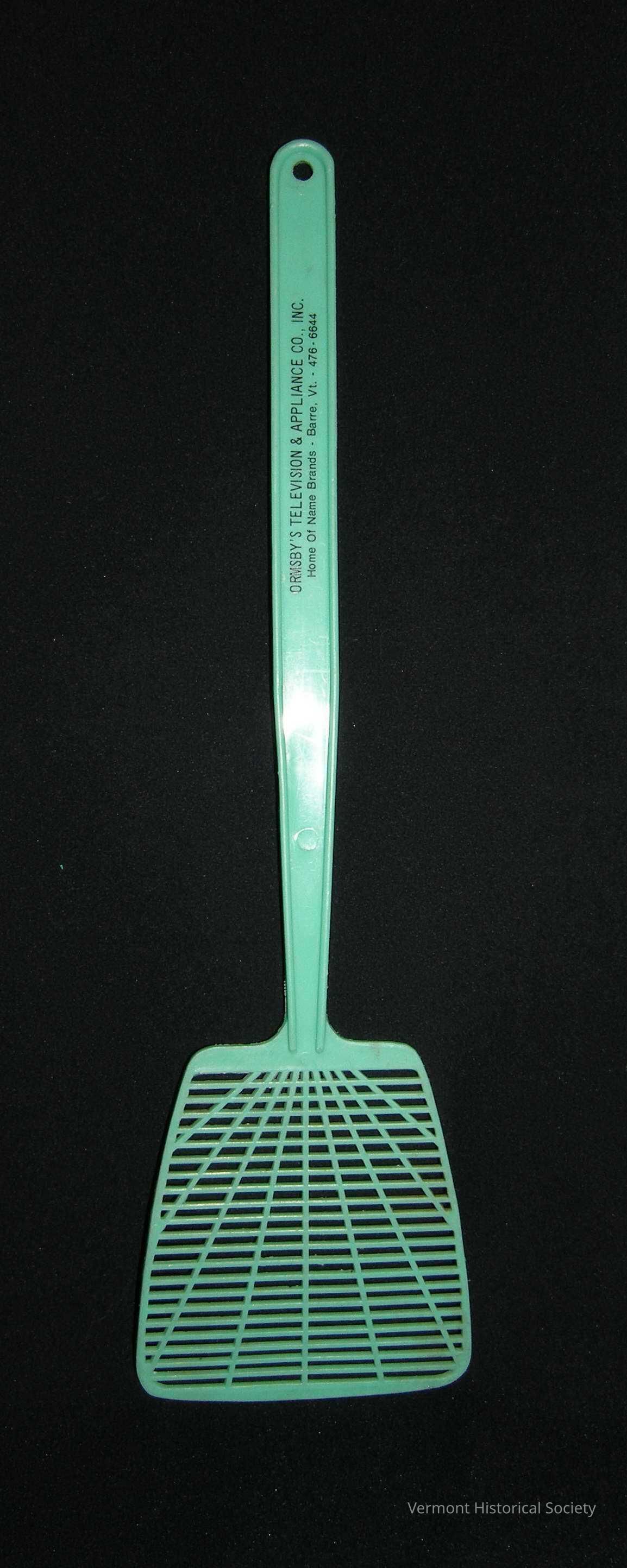 Green plastic fly swatter, with black print on the handle that reads "Ormsby's Television & Appliance Co., Inc. Home of Name Brands - Barre, Vt. - 476-6644".