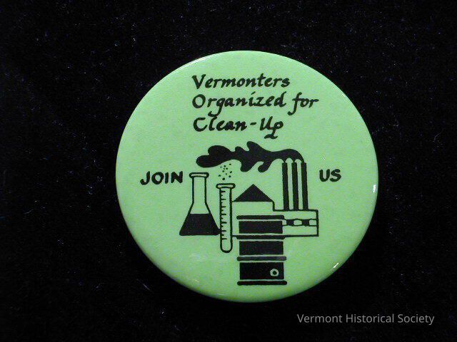 Chartreuse pin that reads, "Vermonters / Organized for / Clean-Up / JOIN US" in black print. Between the words "JOIN US" is a composite image showing a chemist's flask, test tube, oil drum, and a building with 3 smoke stacks with a plume of smoke.Context