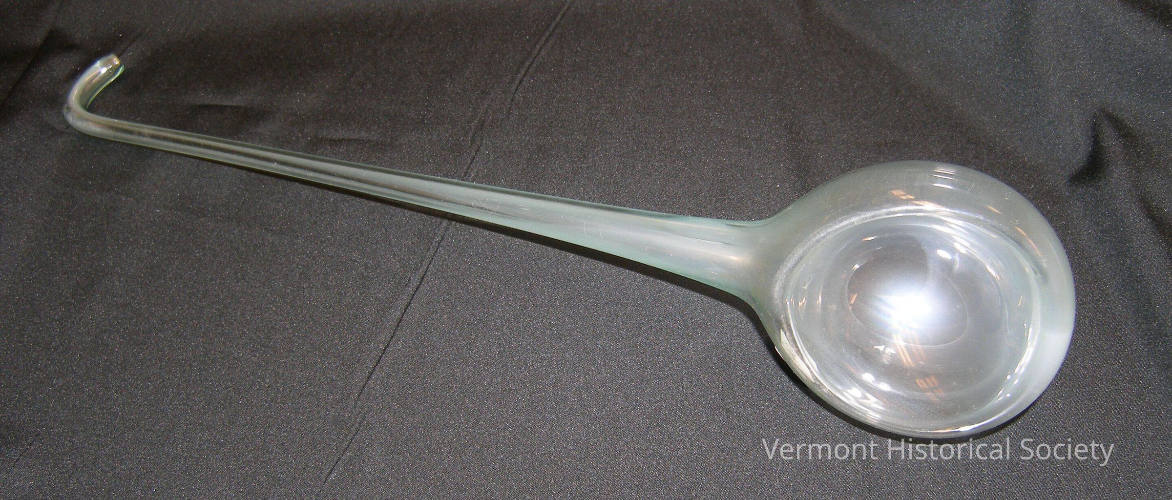 Blown glass ladle. The ladle has a long hollow handle that is curled over at the top. The bowl is large and hollow, and the glass is clouded.