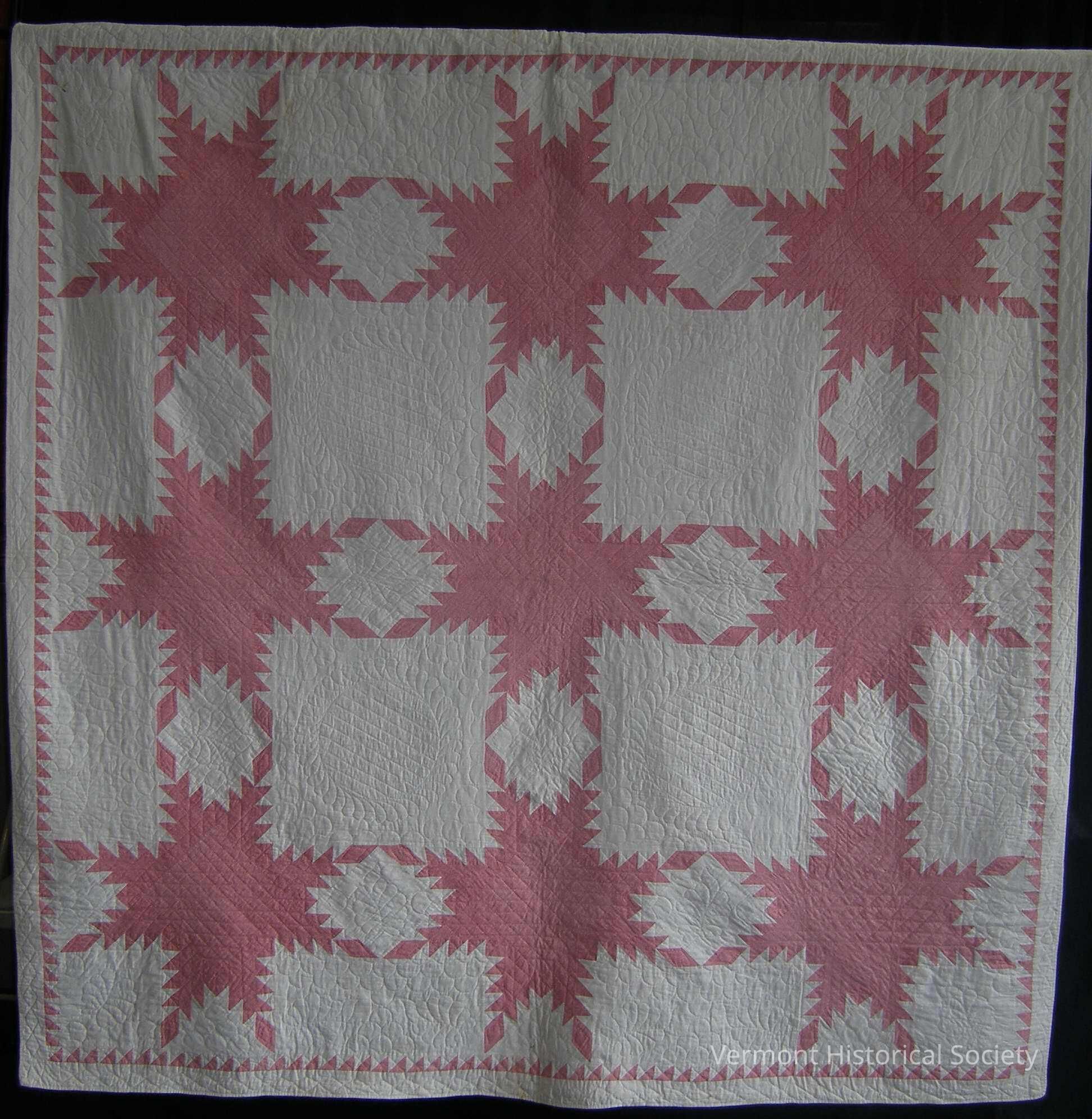 Red and white pieced quilt in a feathered star pattern, likely a variation of a California Star pattern. The quilt is pieced from two fabrics: a pink cotton printed with tiny striped and sprigs and a solid white cotton. It is hand quilted with 8-10 stitches per inch in a pattern of scallops and feathers. There is clamshell quilting in the corners of the white squares with a quilted medallion in the center. The pink stars have grid quilting in their centers.Context