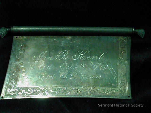 Silver casket plate. Inscribed onto the center of the plate are the words "Ira R. Kent / Died Oct. 9th 1875 / Aged 42 years." The top edge of the plate is rolled with fringe on either side creating the illusion of a scroll. The plate has an engraved vine border on the side and bottom edges. The plate is mildly tarnished with four ballpoint pen size holes in each corner.