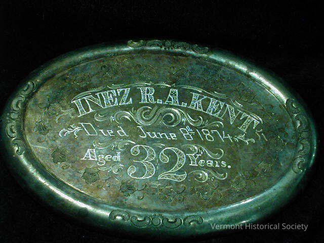 Oval casket plate. Possibly quadruple plated, the plate is inscribed, "Inez R.A. Kent / Died June 8th 1874 / Aged 32 years" with scrolling floral decoration around the words. There is a delicate floral border just inside the rolled edge of the plate.