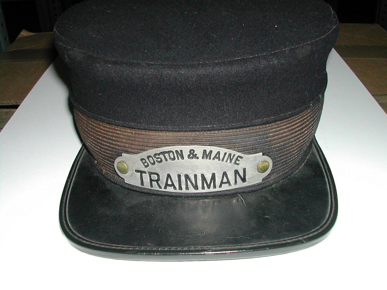 Wool, flat-topped train conductor's hat with square, leather-covered brim. At the center front is a metal plate with the stamped inscription, "BOSTON & MAINE / TRAINMAN".