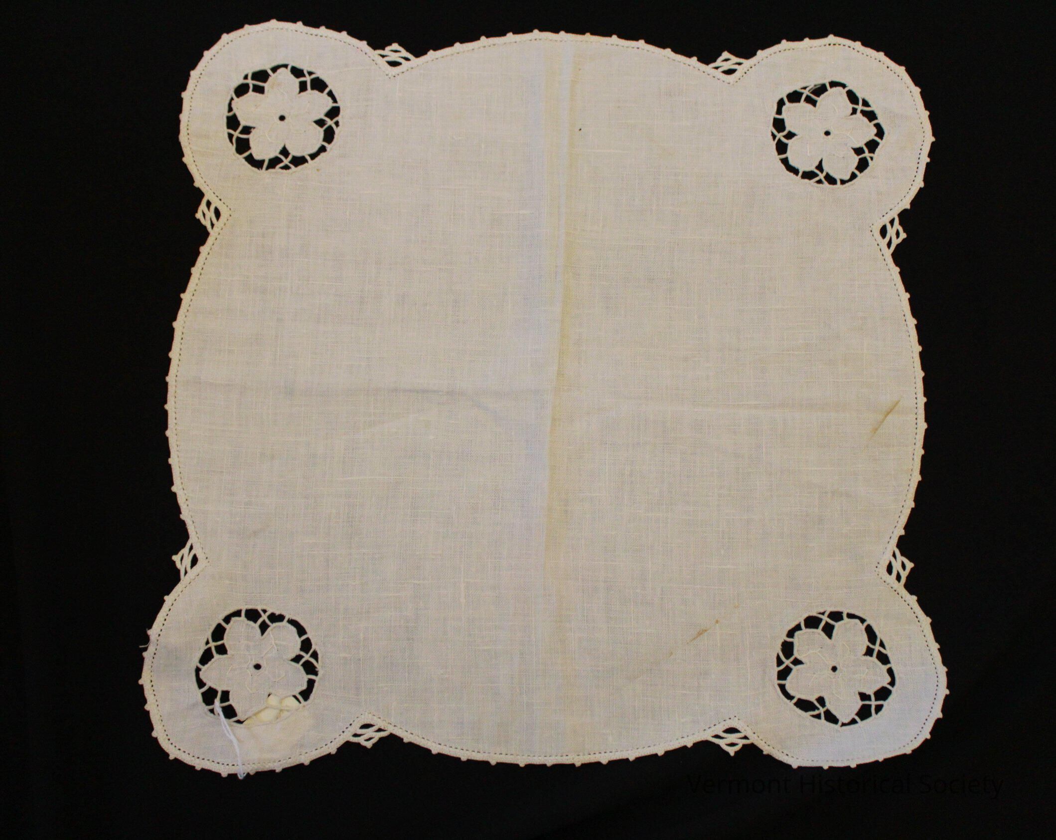 White linen table mat with lobed corners. There is a cutwork flower in the center of each corner lobe.