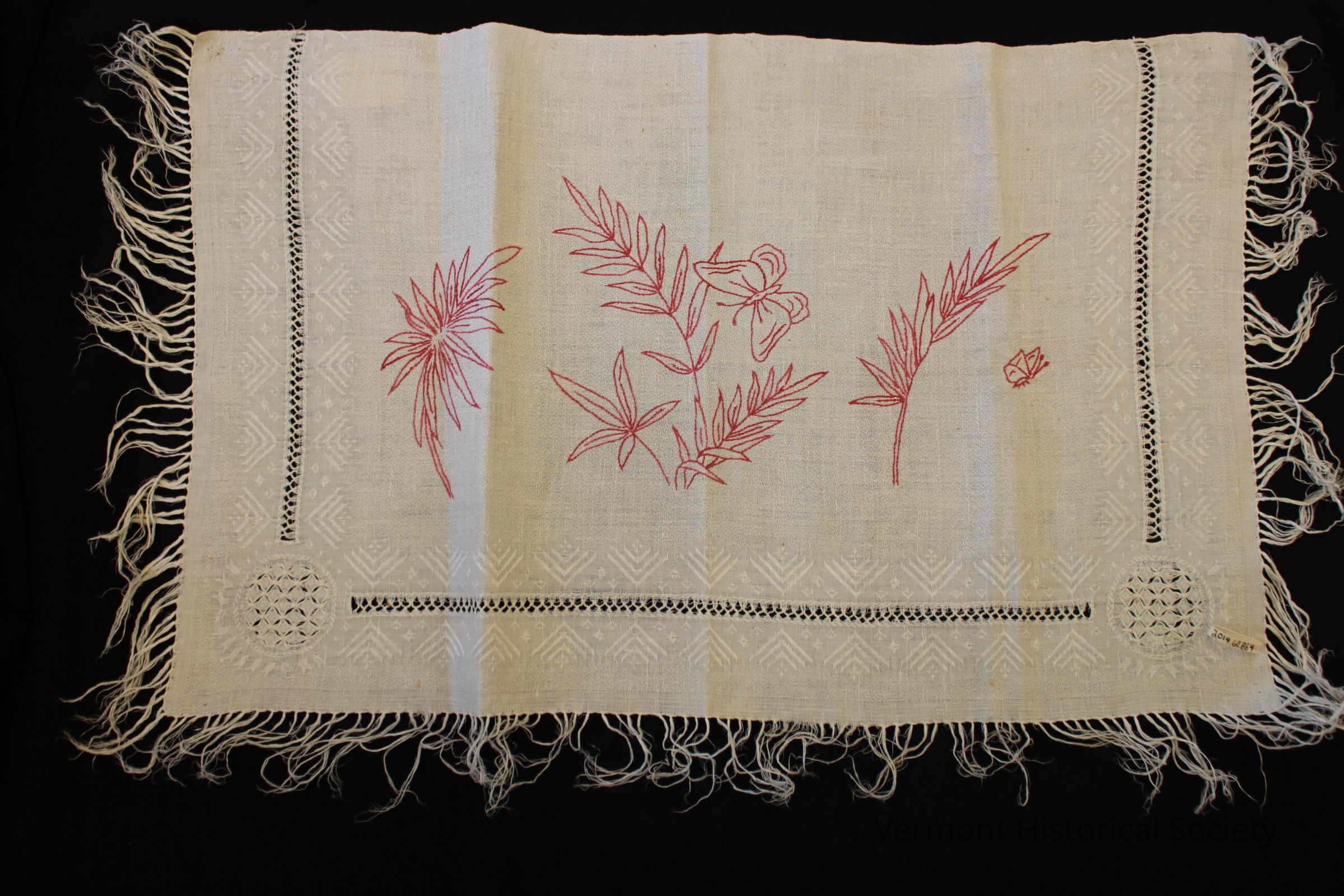 White linen table mat or splasher. It is woven with a damask geometric border enhanced with openwork. The center is embroidered in red with a line drawing of spiky-leaved leaves, possibly palm, and butterflies.