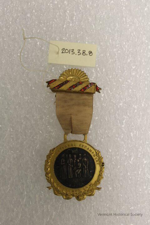Small gold bar with pin on back. Semi-circle top with fan-like pattern encircling the date 1901 and the words LADIES OF THE G.A.R. in gold letters on a red banner. The top piece is attached to a beige ribbon with a cold medal hanging from the bottom. The medal is stamped across the top with the words "35TH NATIONAL ENCAMPMENT" and "CLEVELAND OHIO" across the bottom. In the center is a metal coin of sorts with the image of a group of women in the center
