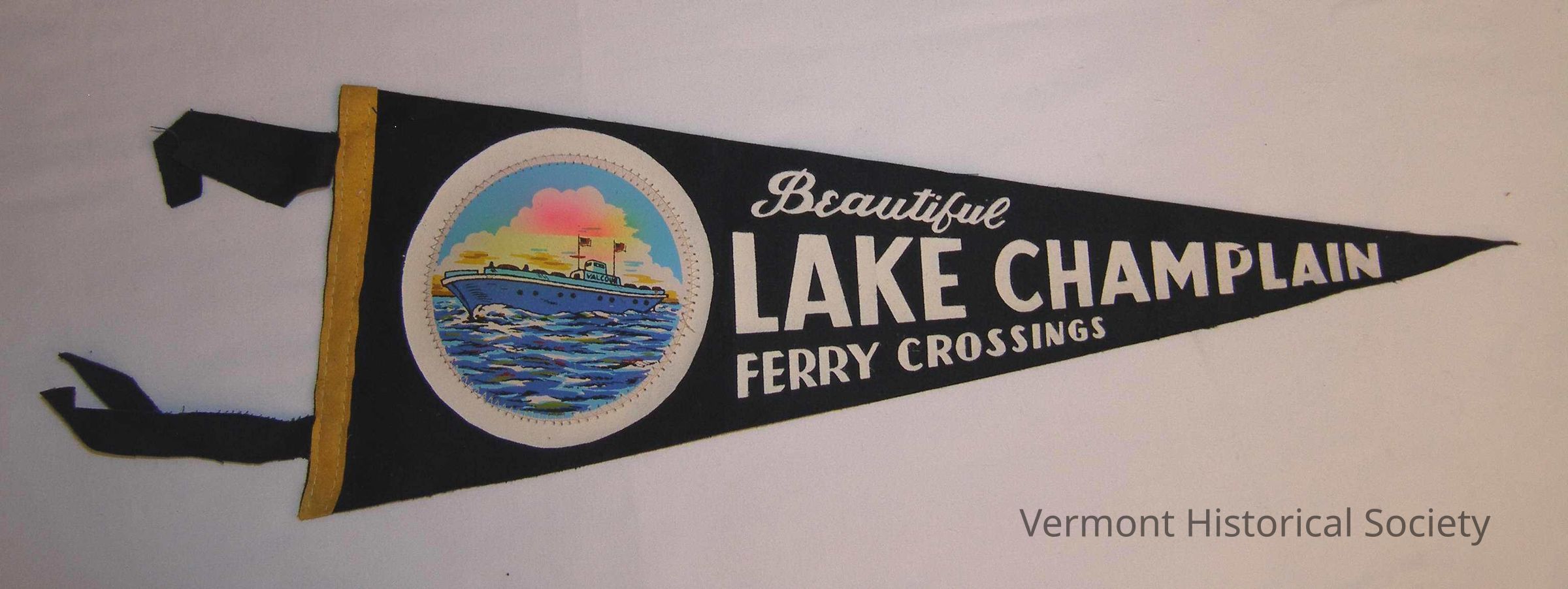 Dark blue pennant printed in white with the inscription, "Beautiful LAKE CHAMPLAIN FERRY CROSSING". At the wide end of the pennant, a round faux leather patch is appliqued to the pennant. The patch is hand-painted with a scene of a large ferry boat on water, with a large cloud behind. The short edge of the pennant is bound with yellow felt, and there are green tabs.